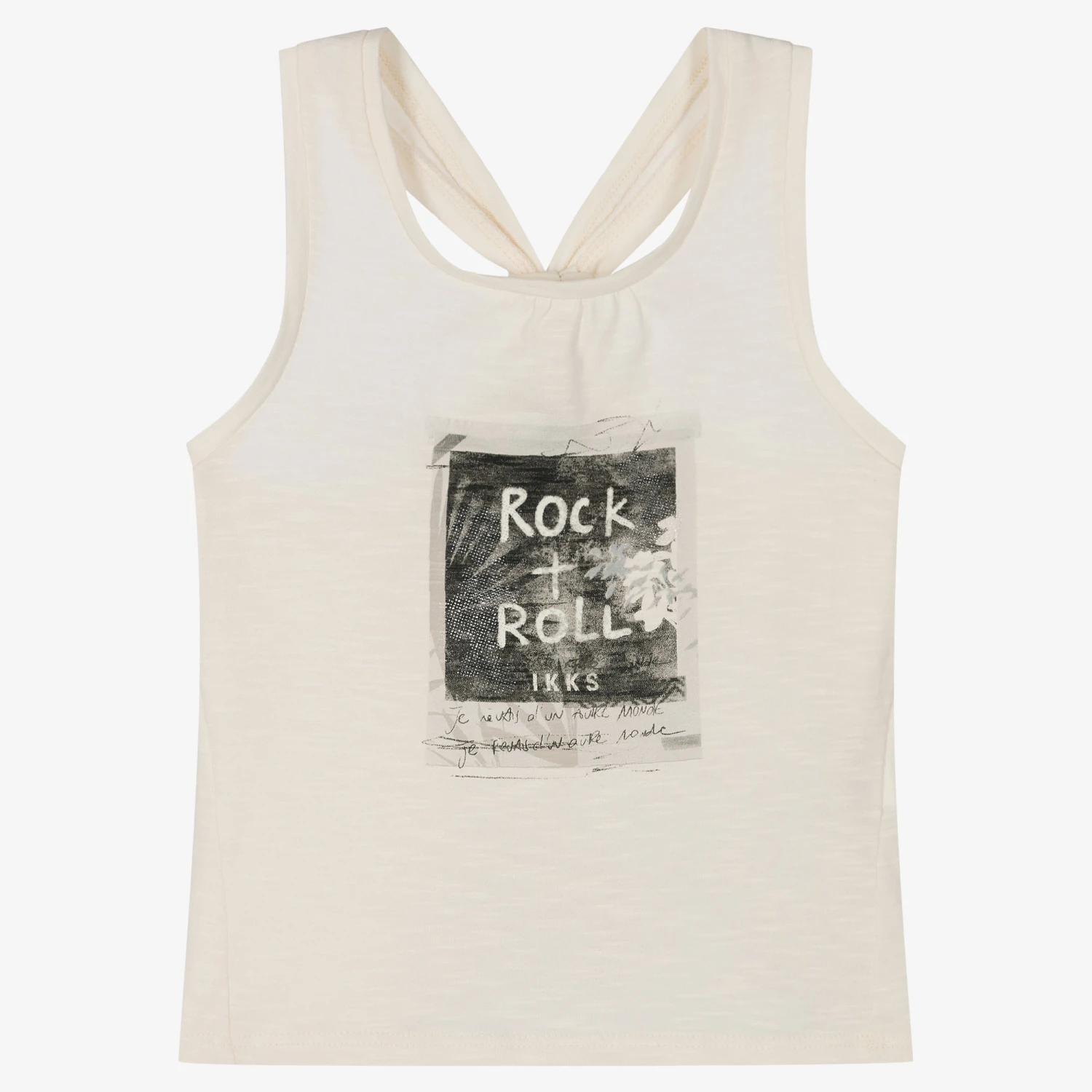 Ivory sleeveless T-shirt for girls by French brand IKKS, made in soft and lightweight cotton jersey. Cool and casual, it has a polaroid picture design with a ‘Rock + Roll’ slogan printed on the front, and a racer back with a decorative braided knot.
