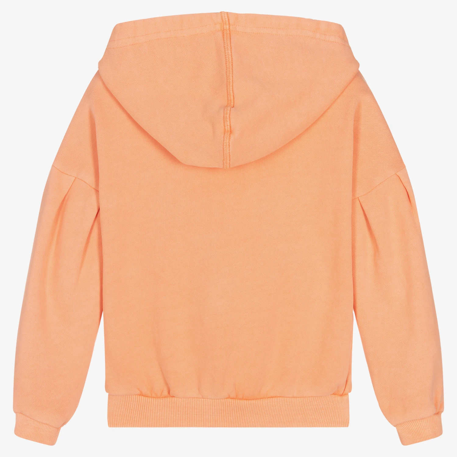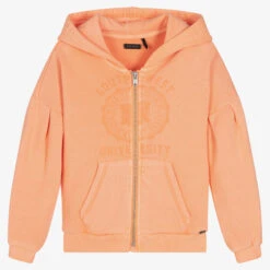 Bright orange zip-up hoodie for girls by French brand IKKS, made in soft cotton jersey with a looped underside. This cool, varsity-style top has a tonal university-inspired print, pockets and a charm logo on the front.