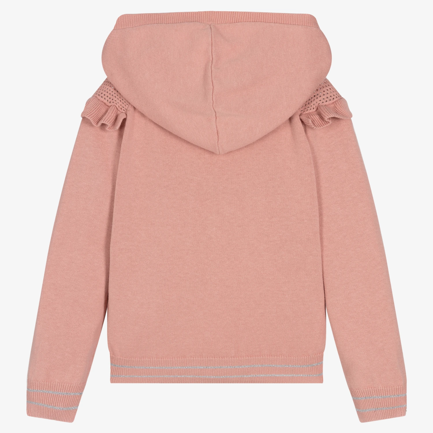 Dusty pink zip-up hoodie for girls by French brand IKKS, knitted in beautifully soft cotton. It has intricate openwork detailing with ruffled trims, pockets and a charm logo on the front. For a cute yet functional style, there are ribbed cuffs with sparkly silver stripes.
