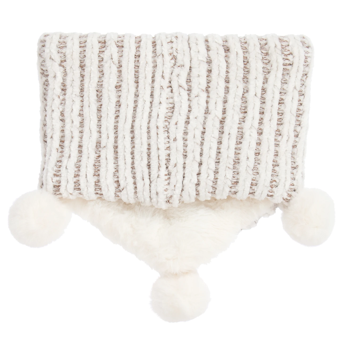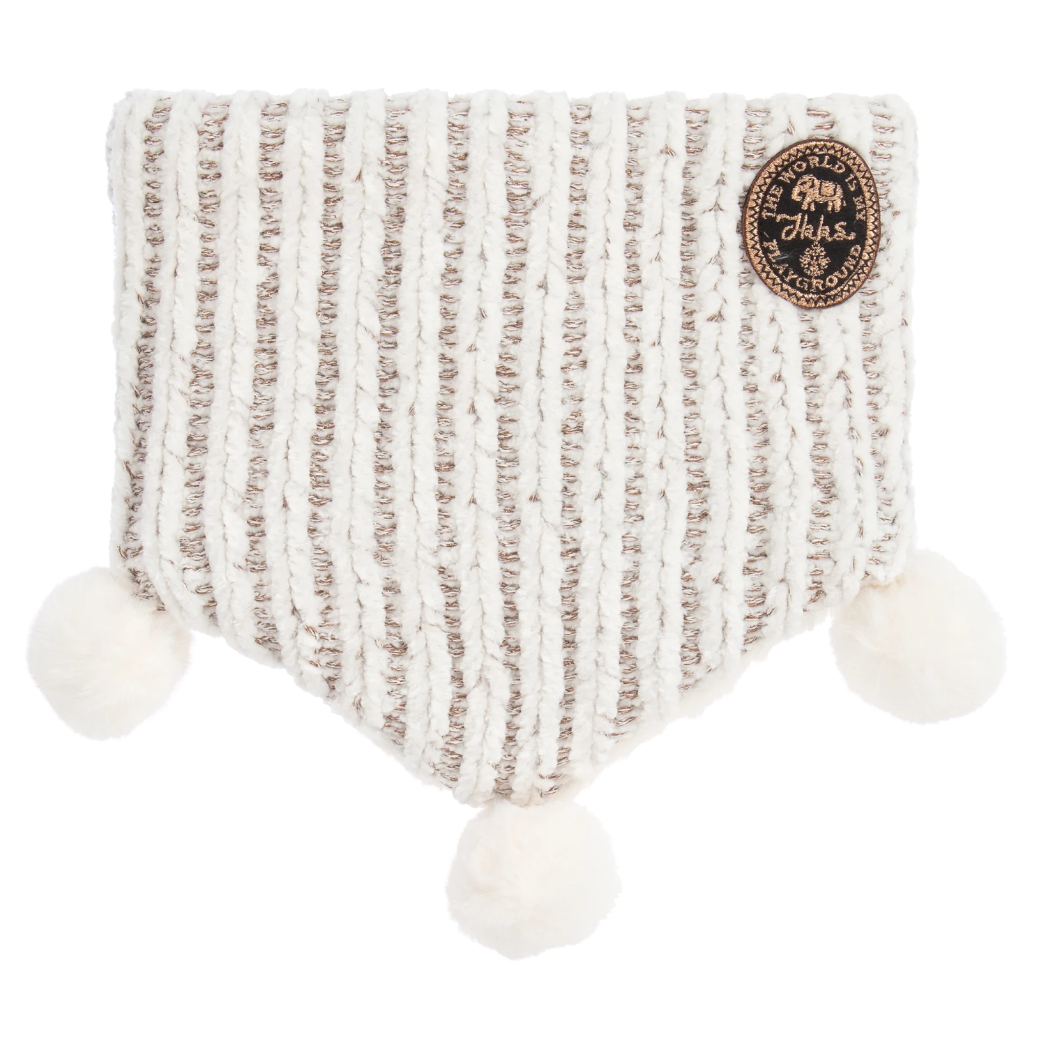 Ivory pom-pom snood for little girls by French brand IKKS, with metallic brown flecks. Made in a chunky polyester knit, it is trimmed with plush ivory pom-poms. Lined in soft ivory faux fur, there is a black and bronze logo patch on one side.
