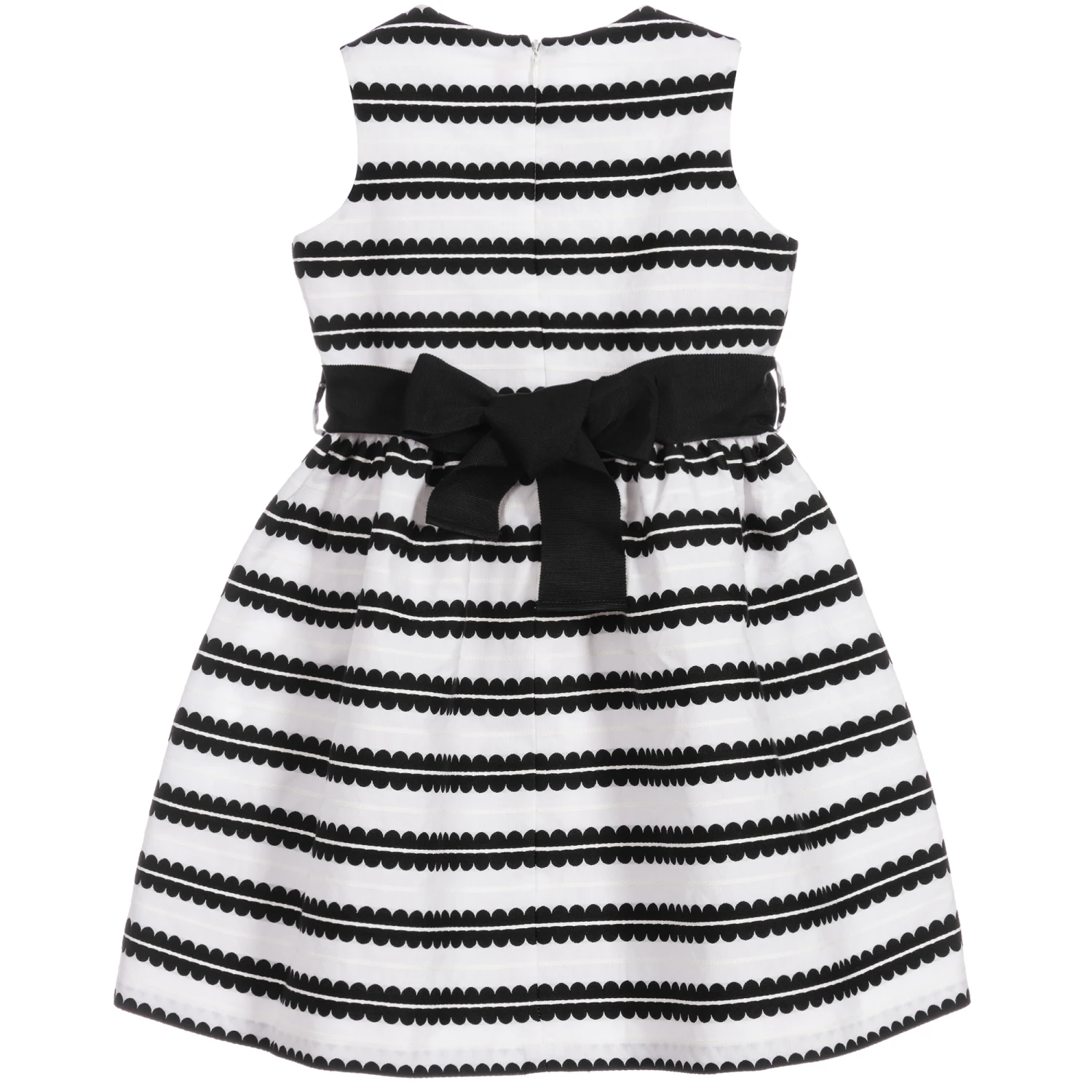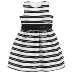 A striking black and white woven patterned cotton dress by Il Gufo. It has a wide black grosgrain tie belt, with an embroidered signature logo on the front. The full petticoat lining is soft and comfortable and there is a zip fastening on the back.