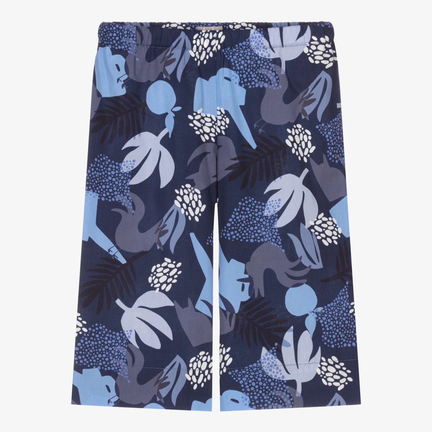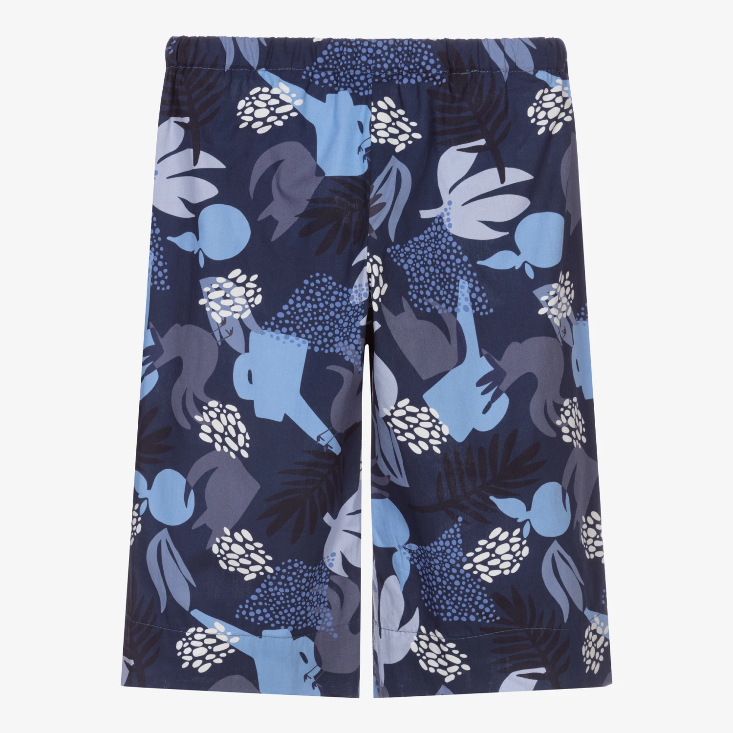 Dark blue cotton culotte trousers by luxury Italian designer Il Gufo. Soft and lightweight, they are printed with an abstract floral design in shades of blue and white. They have a comfortable elasticated waistband.