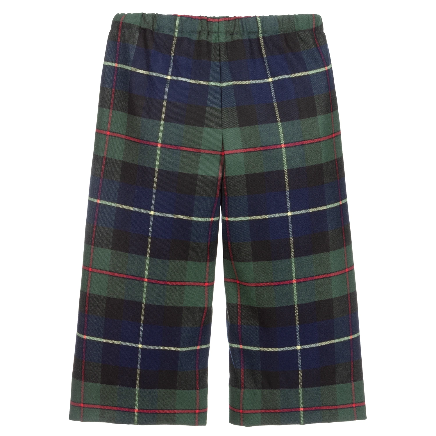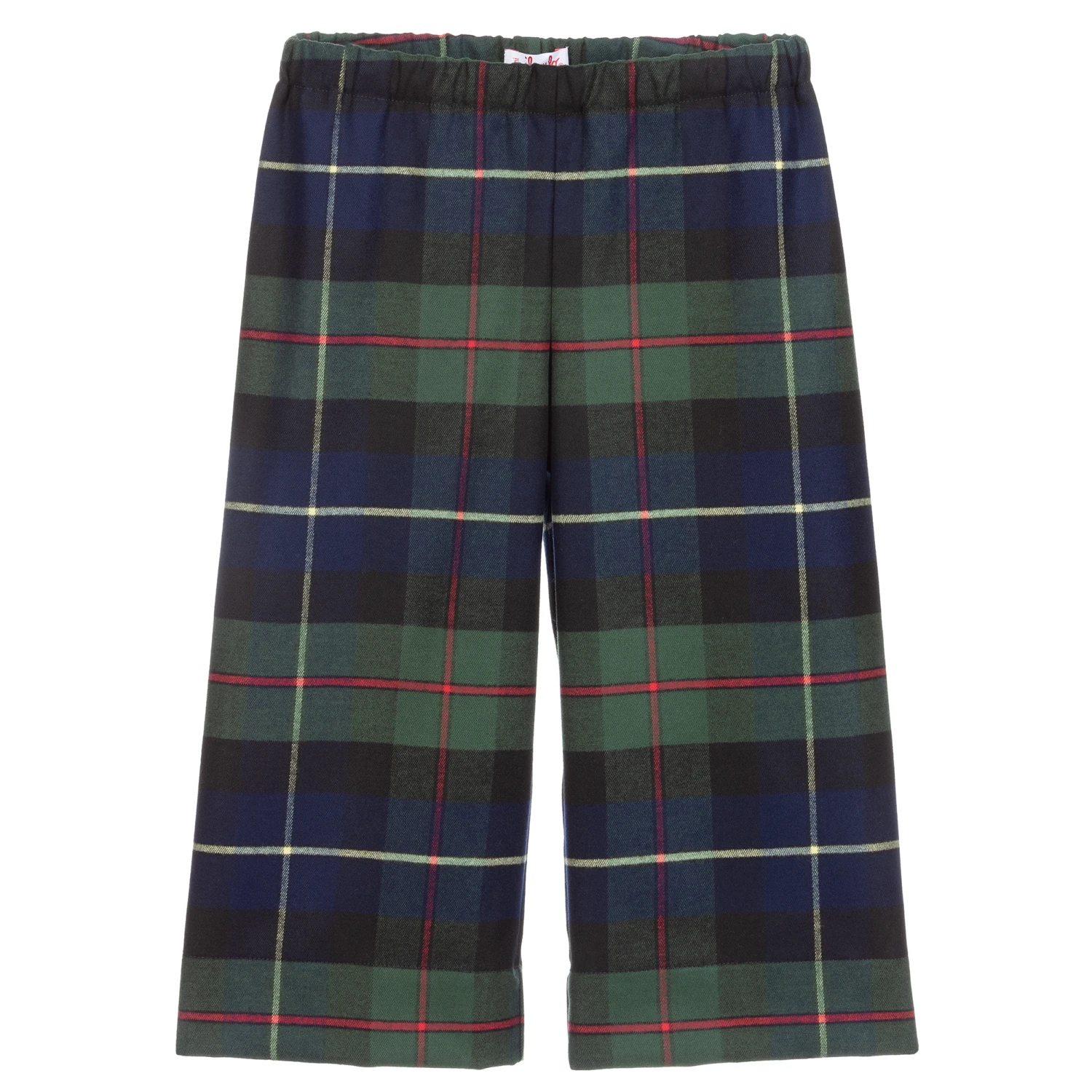 Girls blue and green tartan culottes by Il Gufo, with a large red and yellow check. Made in soft brushed polyester and viscose blend, they are calf length with an elasticated waist and comfortable wide legs.