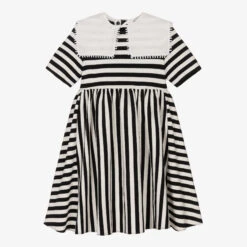 Black and white striped dress for girls from luxury designer Il Gufo. This striking design is made in soft, stretchy and comfortable jersey, with alternating horizontal and vertical stripe panels for a unique style. Trimmed with embroidered dots, the white cotton voile sailor collar ties on the front, and is removable to switch up her look.