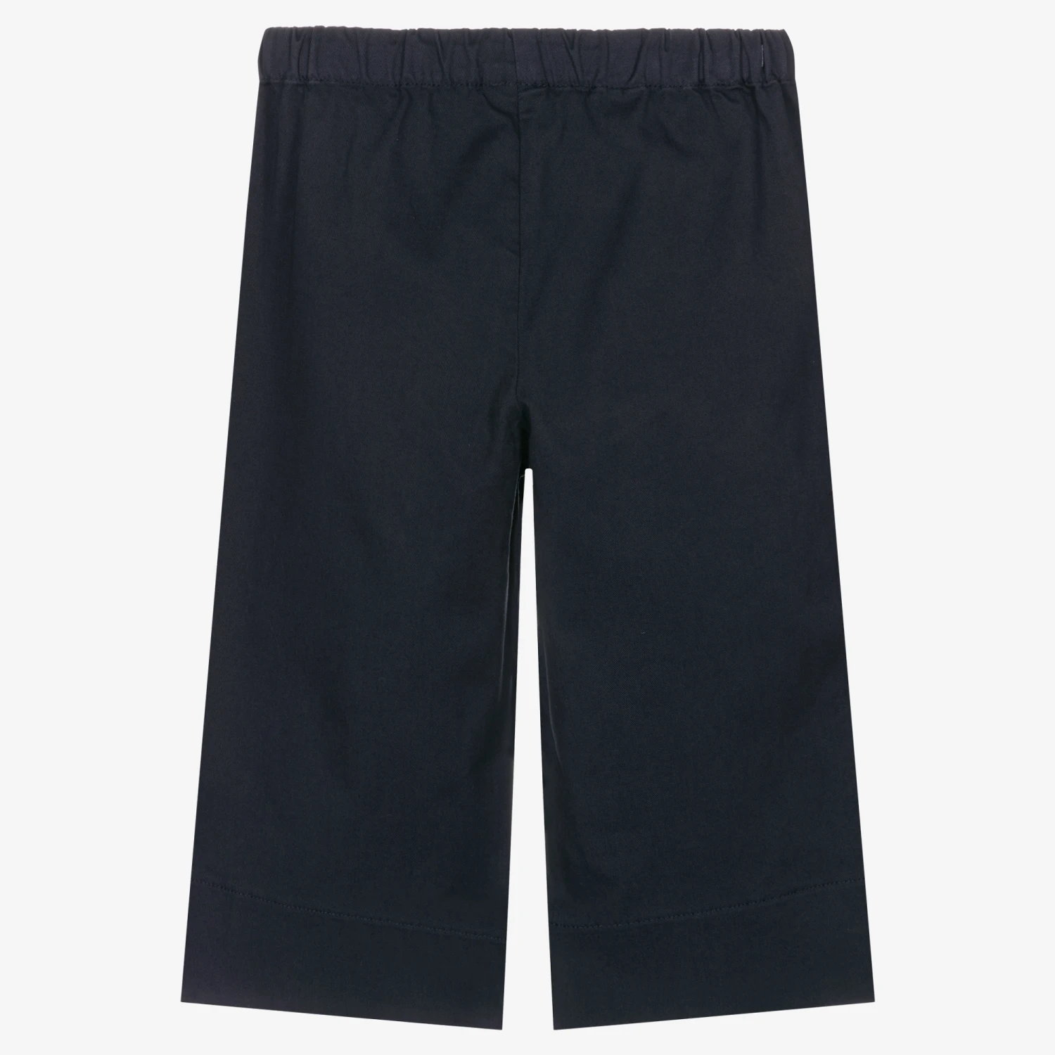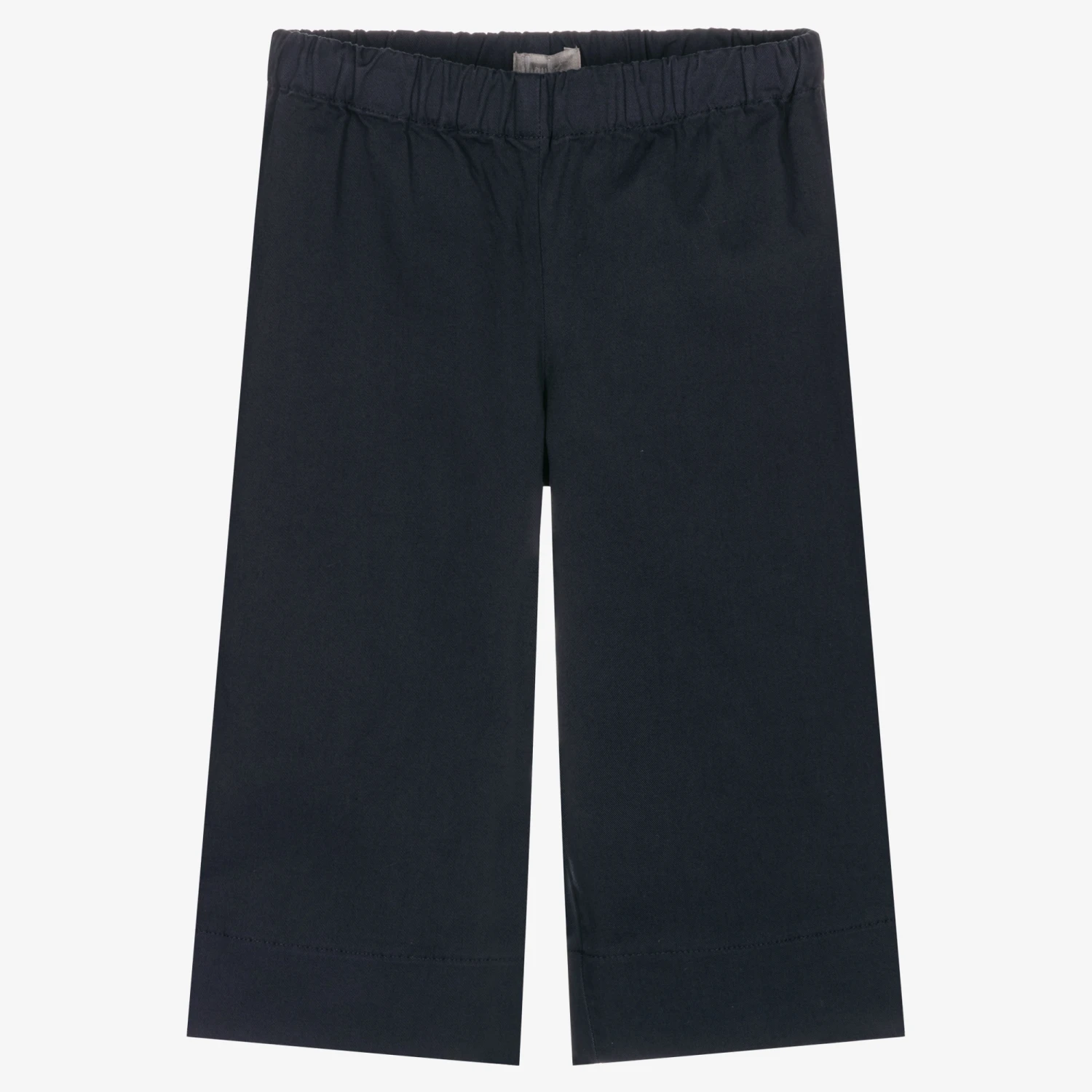 Navy blue culotte trousers for girls by luxury Italian brand Il Gufo. Made in cotton twill with a slight stretch, they have a comfortable elasticated waistband.