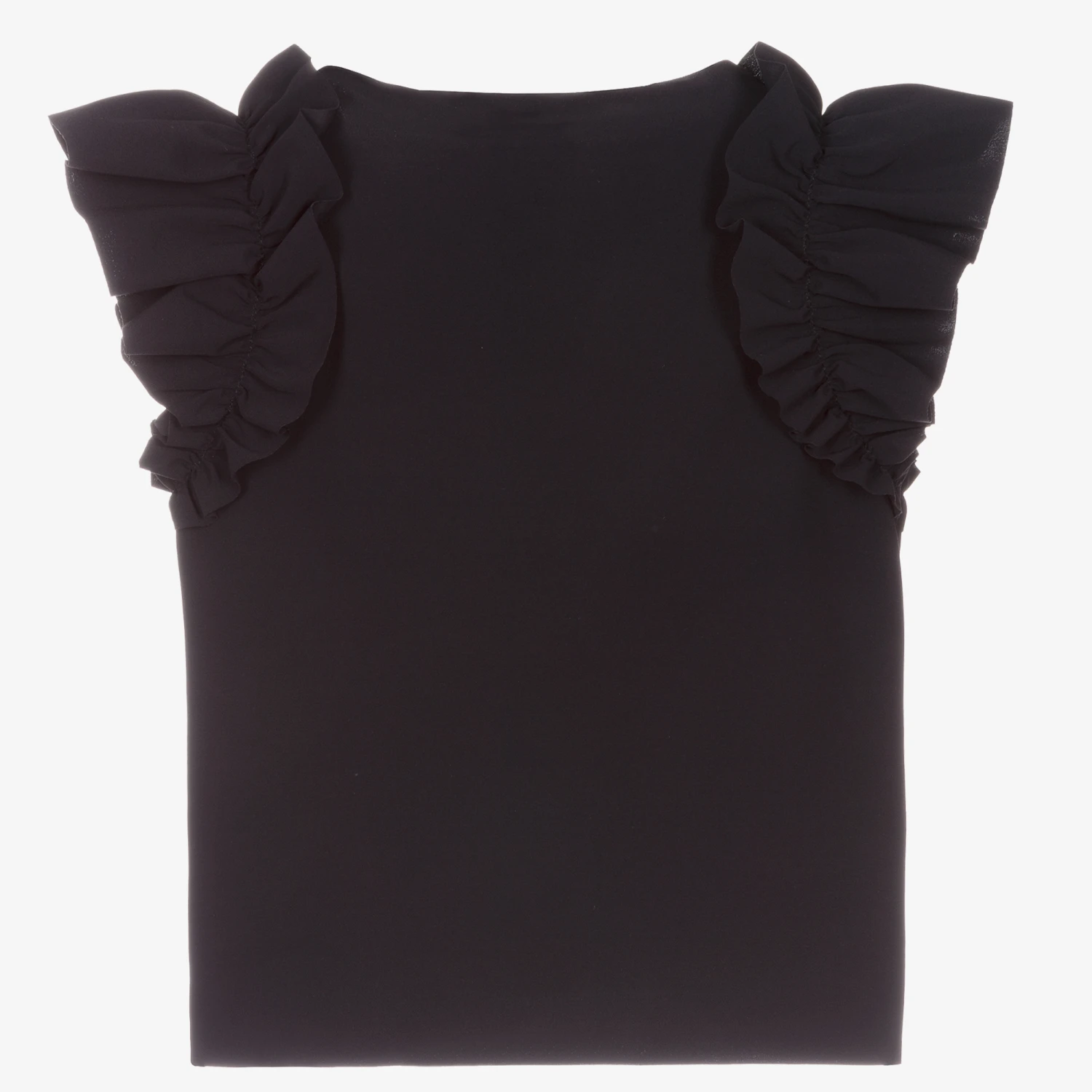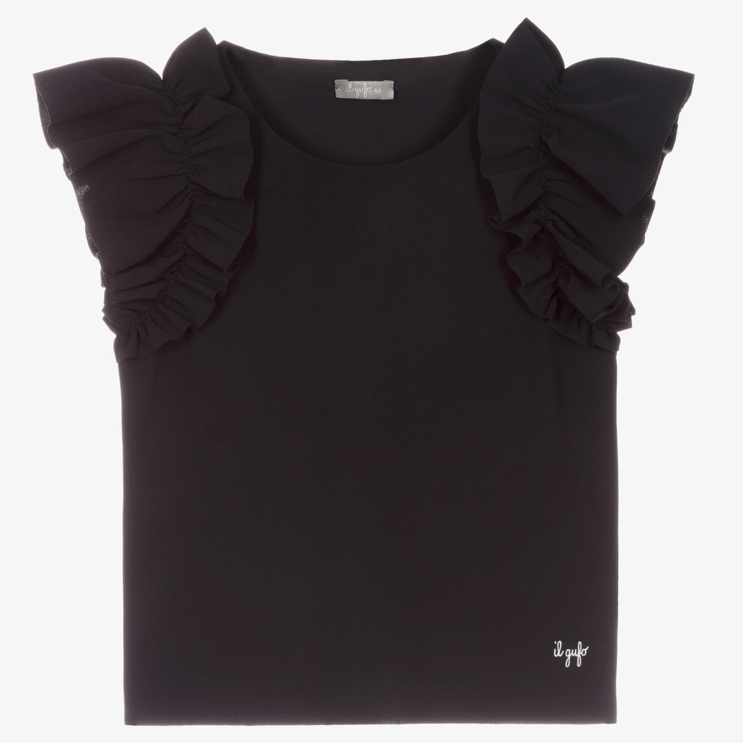 Navy blue blouse for girls by luxury Italian brand Il Gufo, with ruffles over the shoulders. It is made in lightweight, silky jersey with a raw-edged neck and hemline. It is a Sensitive® fabric that is long lasting, wrinkle free and easy to care for. The designer’s logo is printed by the hemline in white.