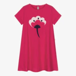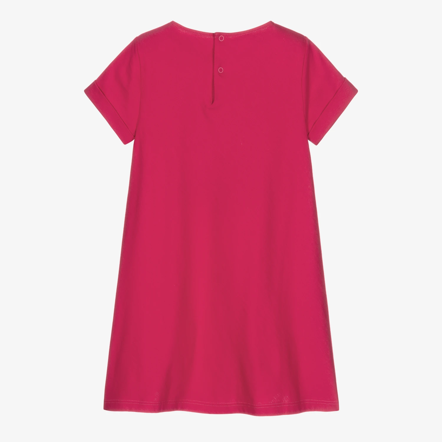 Fuchsia pink dress for girls by luxury Italian designer Il Gufo. Made in soft and stretchy cotton jersey, this A-line dress has turned-up sleeve cuffs and a tonal pink and navy blue tulip flower appliqué with 3D pink petals. The designer’s logo tab can be found on the side seam.