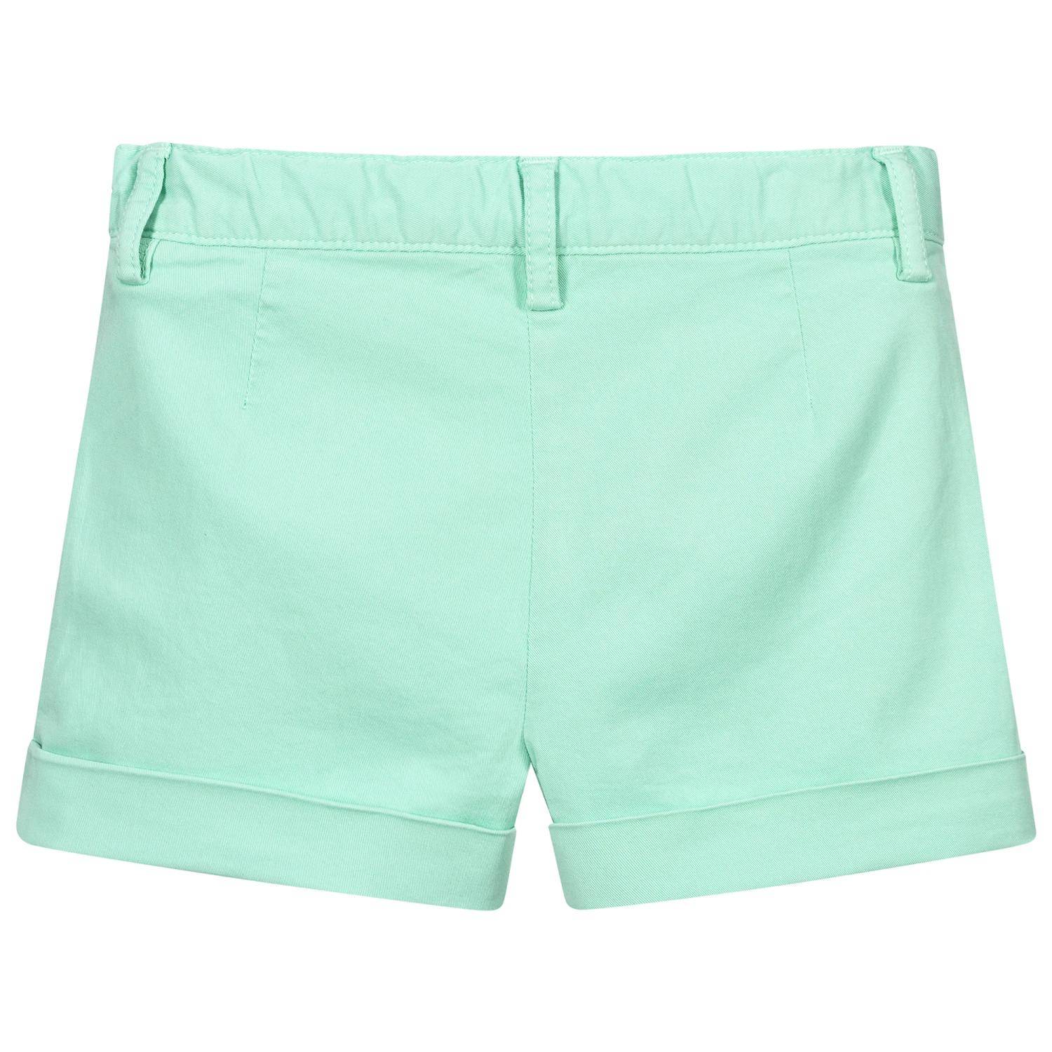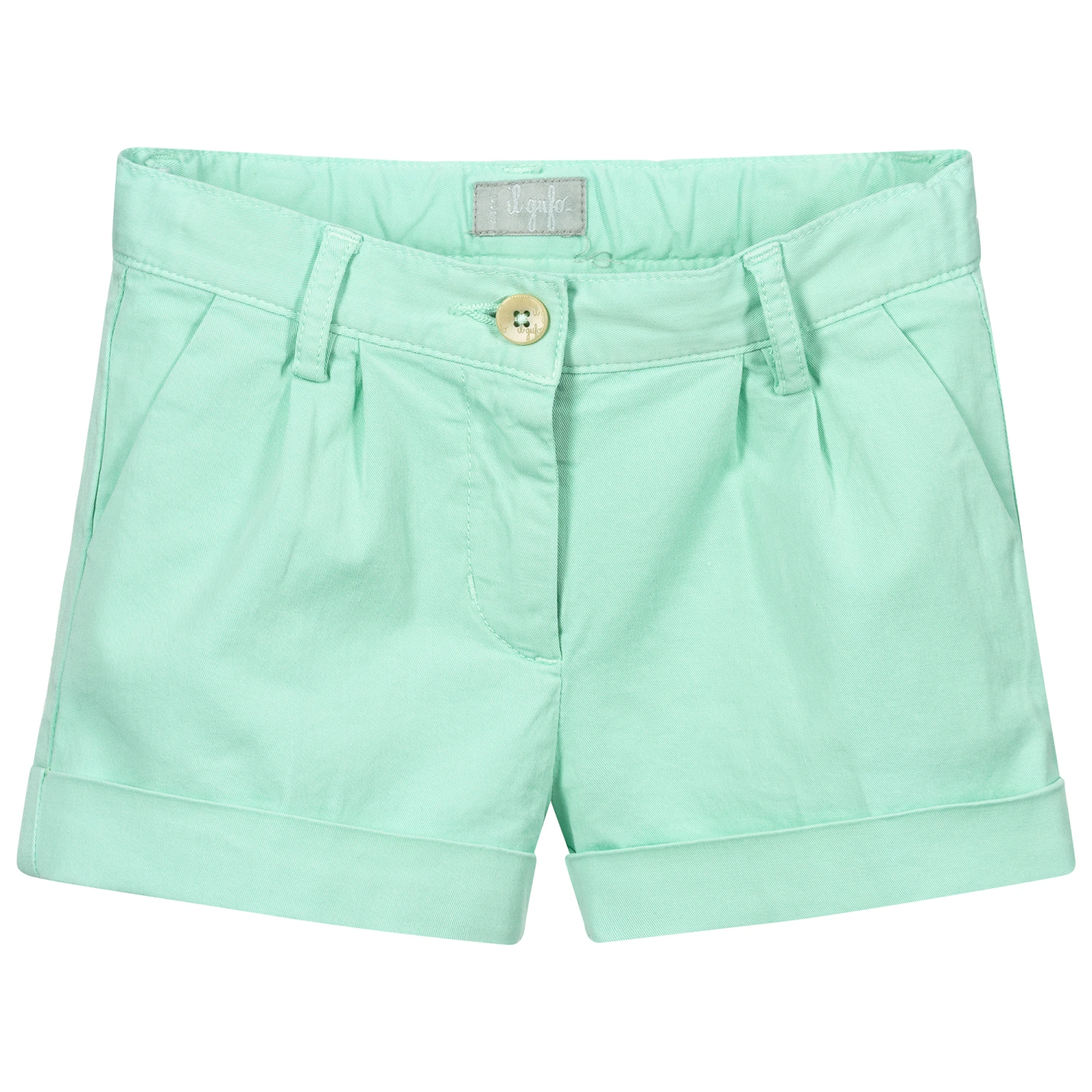Aqua green shorts for girls by Il Gufo, made in lightweight cotton twill. They have slanted front pockets, with a button and zip fastening and a useful adjustable waist.