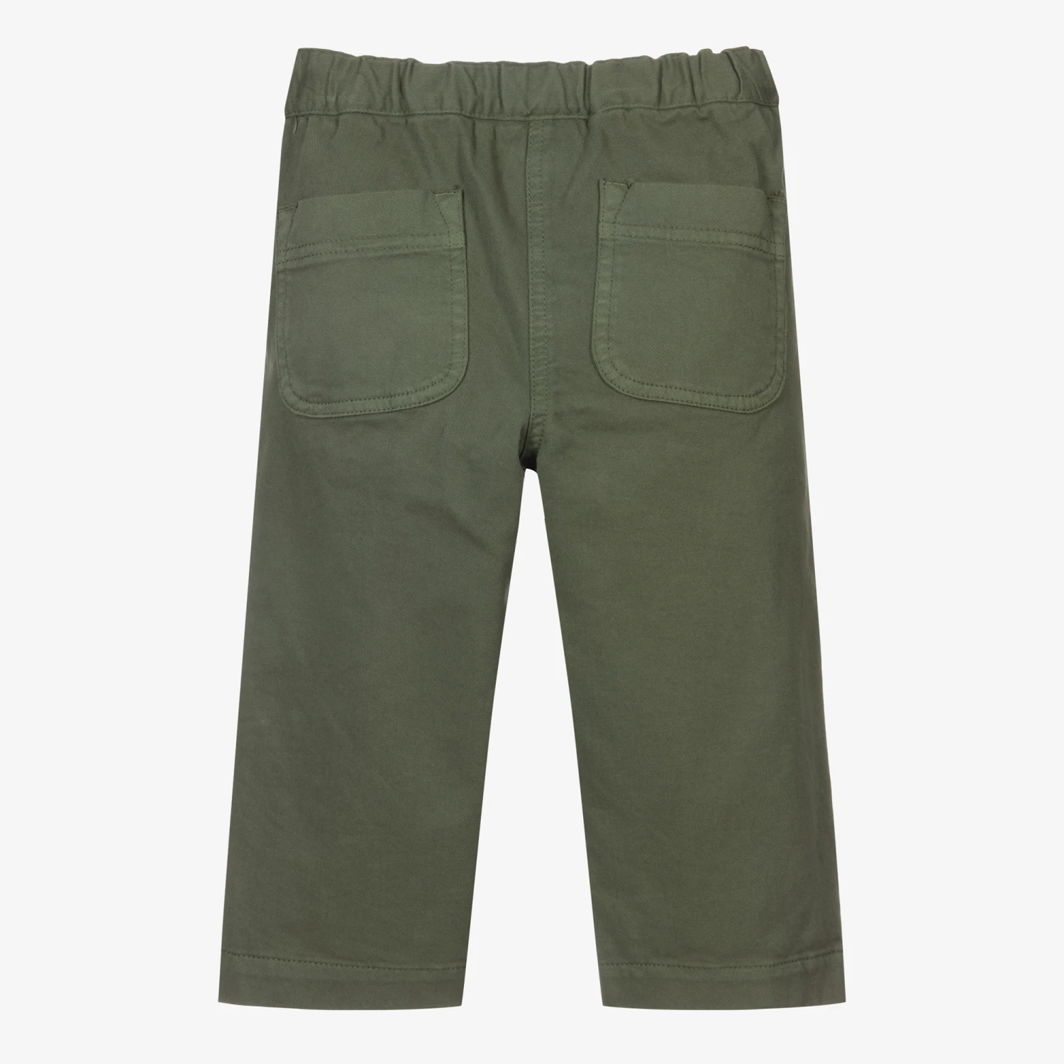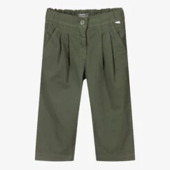 Girls khaki green, wide-leg trousers from Italian brand Il Gufo. They are made in soft cotton twill, with pleats on the front. They have slanted side pockets and a partly elasticated waistband.