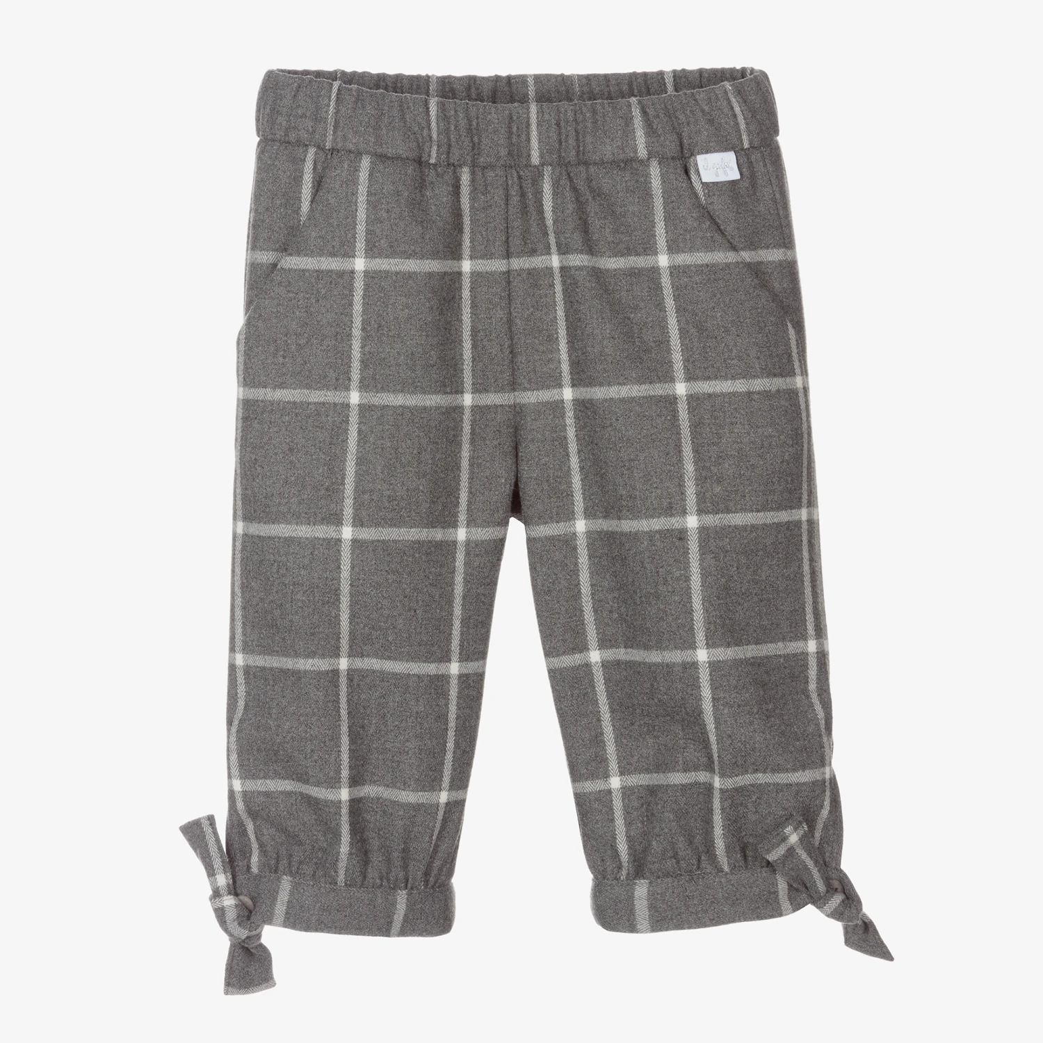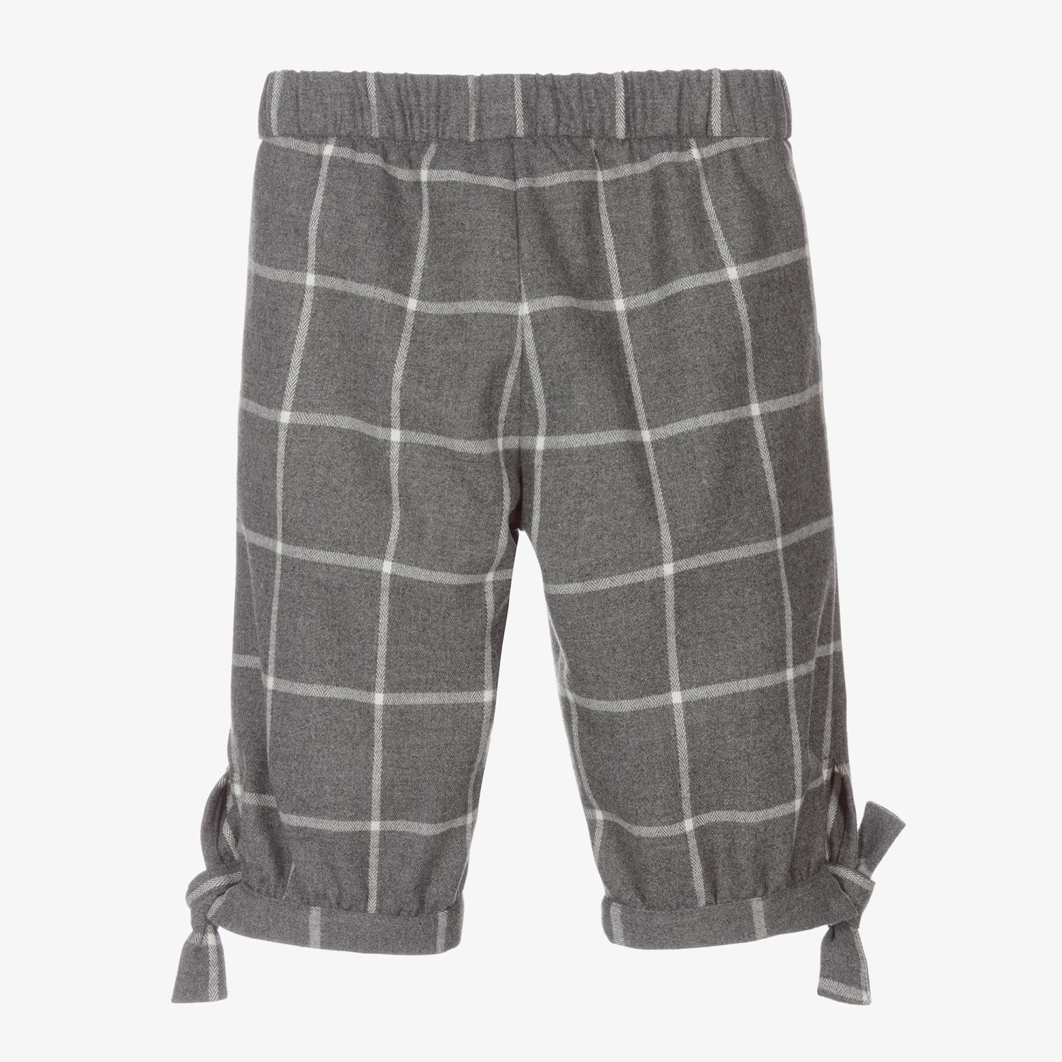 Grey and ivory checked trousers for younger girls by luxury Italian brand, Il Gufo. Made in soft brushed twill, they have an elasticated waistband, slanted front pockets and cute tie detail on the gathered cuffs.