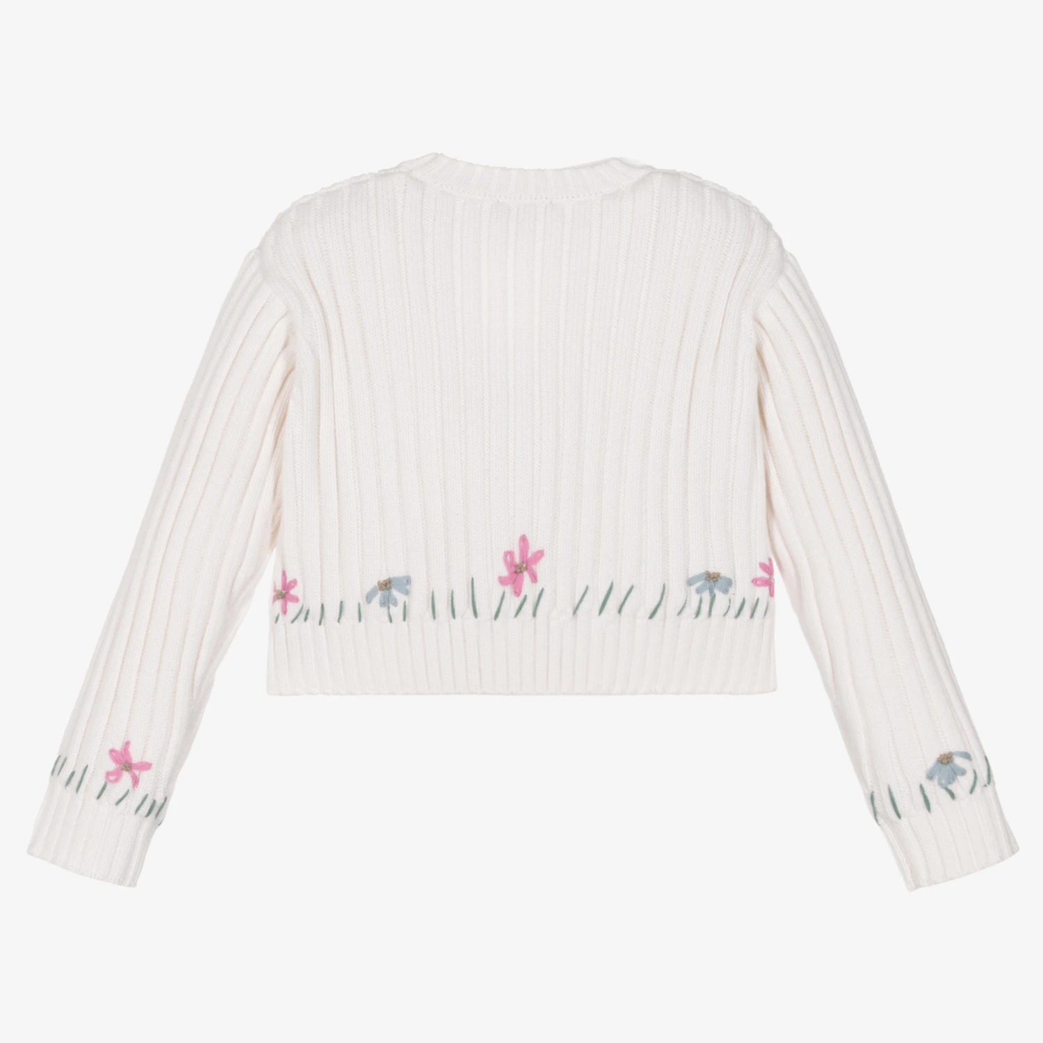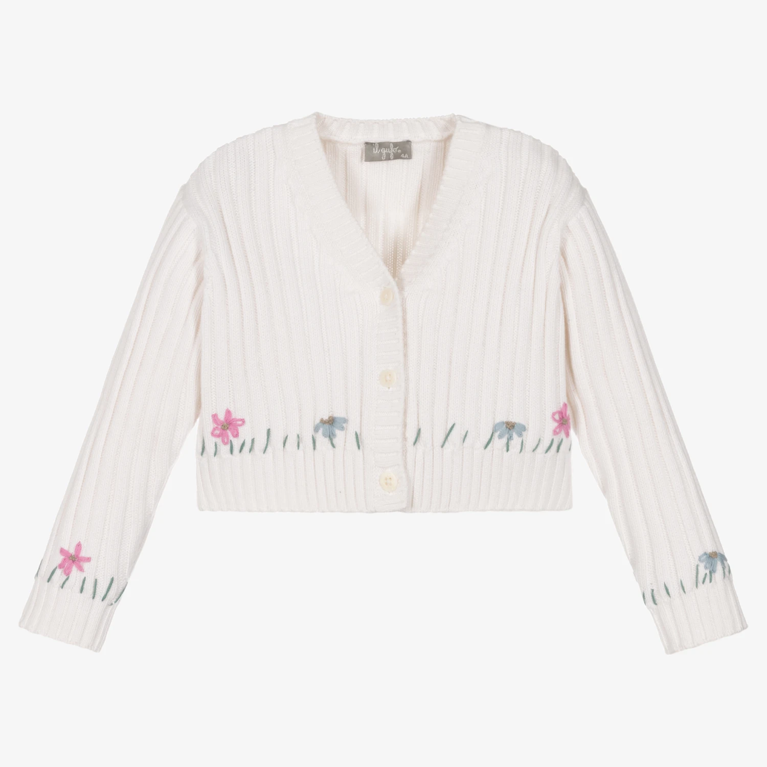 Lovely ivory cardigan for girls from luxury brand Il Gufo, knitted from soft organic cotton. Mid-weight and slightly chunky, this V-neck button fastening cardigan has delicate blue, pink and green flowers embroidered along the hem and cuffs.