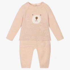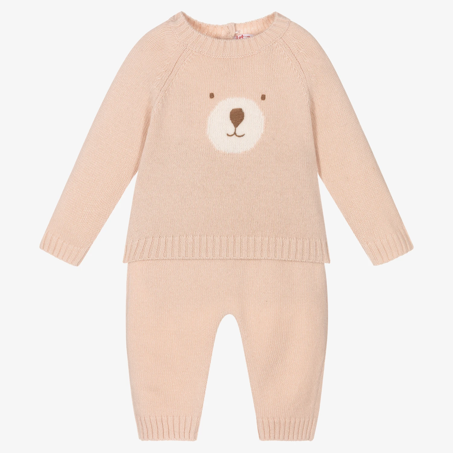 Super sweet pale pink trouser set for little girls by classic luxury Italian designer Il Gufo. The set is knitted in beautifully soft and luxurious virgin Merino wool with ribbed trims for extra cosiness. The top has a lovely ivory bear face intarsia on the front and button fastenings on the back. It comes with comfortable, coordinating trousers that are easy to wear, simply pulling up.
