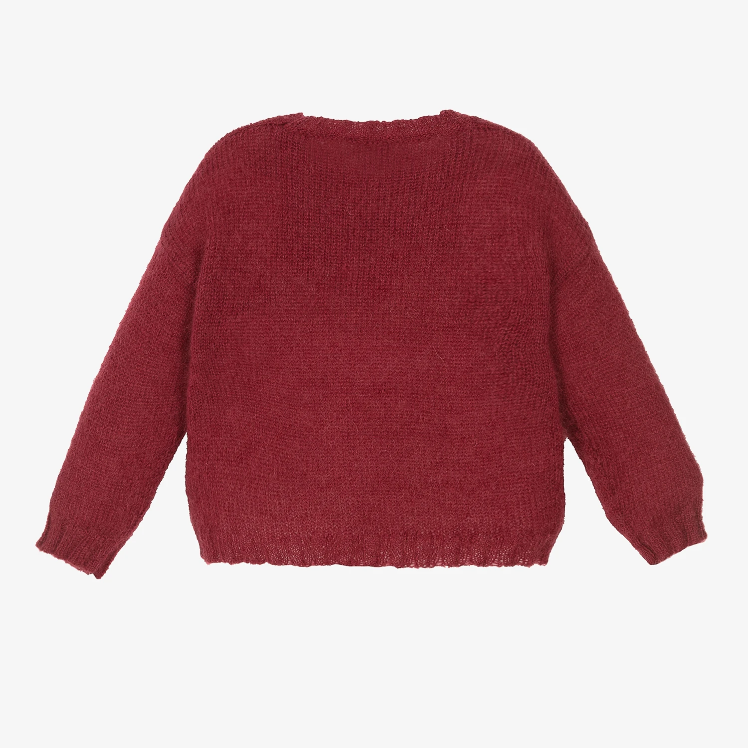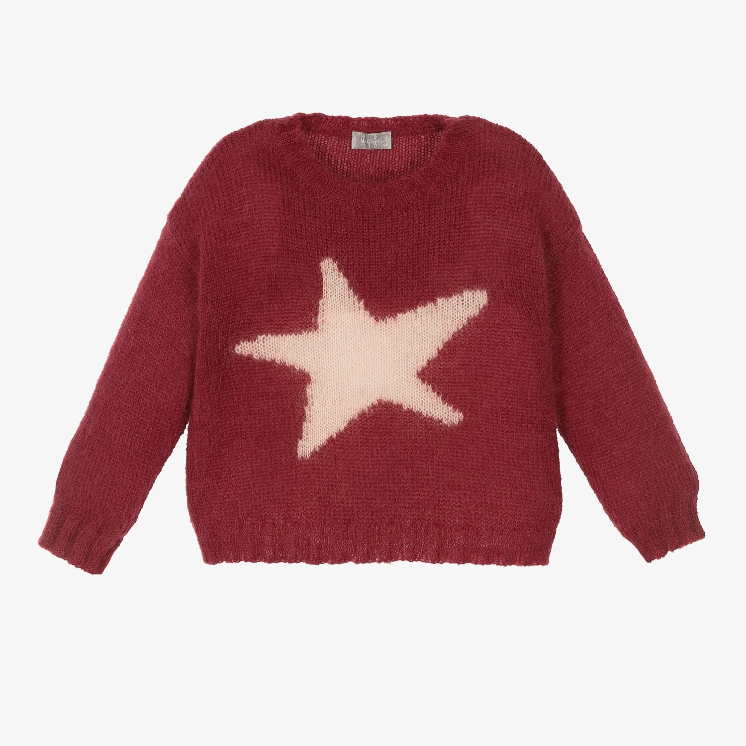 Lovely lightweight, burgundy red sweater for girls by luxury Italian designer Il Gufo. Knitted in a luxurious soft Mohair and wool blend, it has a pale pink star motif on the front for a feminine touch.