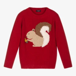 Red sweater for girls by luxury brand Il Gufo, knitted in soft wool. The front has a sweet squirrel woven in beige, brown and ivory.