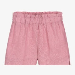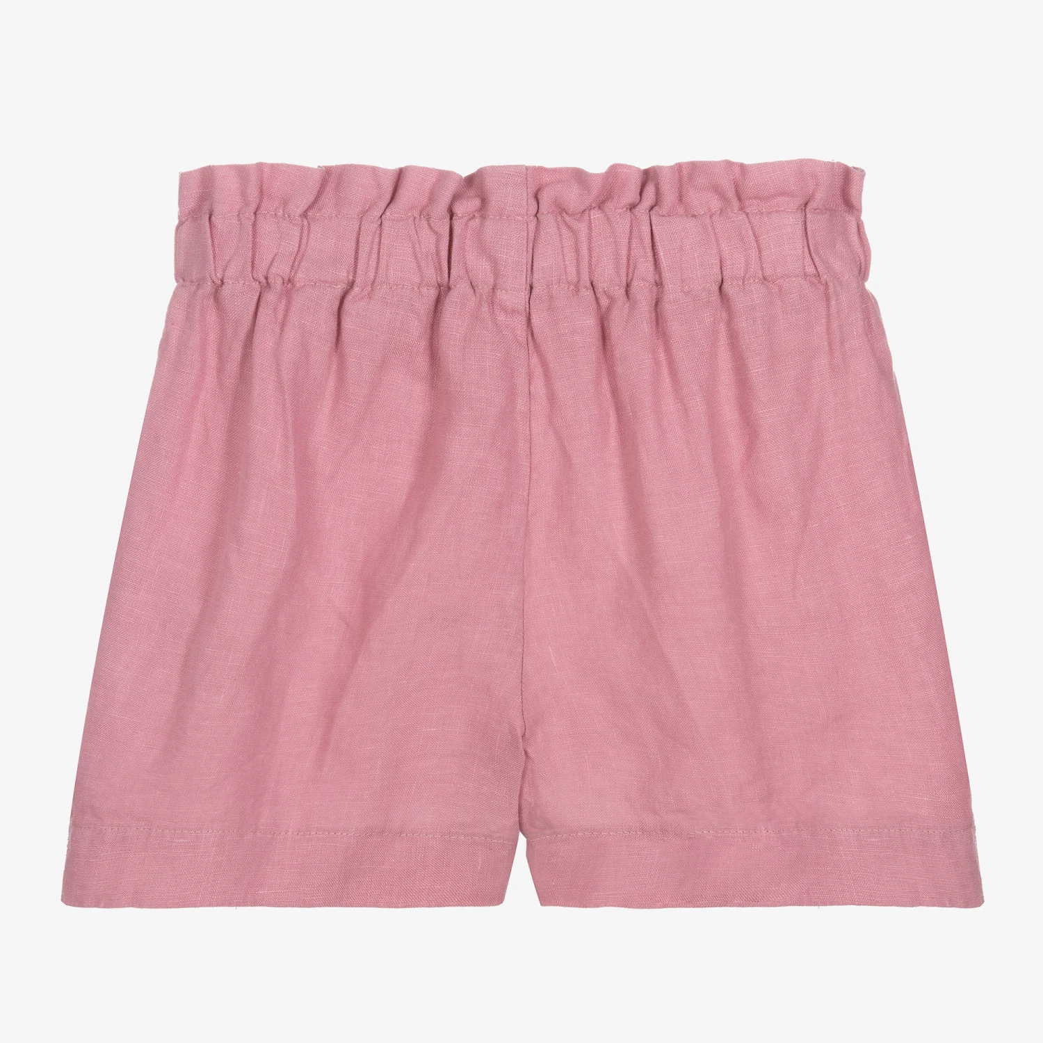 Lovely rose pink linen shorts for girls by Il Gufo, ideal for looking chic on warmer, sunny days. They have a wide leg style for a relaxed fit, and elasticated gathered waist for comfort and style.