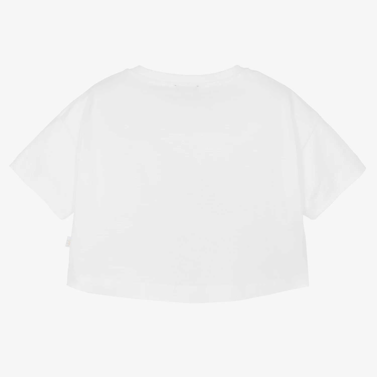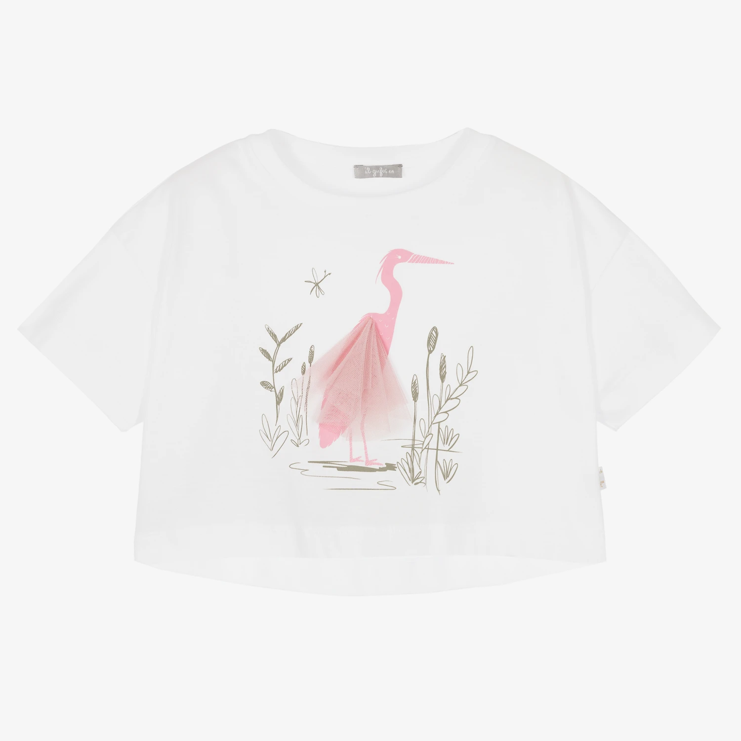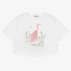 A sweet white cropped T-shirt for girls from luxury designer Il Gufo, made in soft and stretchy cotton jersey. Stamped on the front is a lovely heron print, complete with pink tulle ‘feathers’ and grey-green reeds and foliage. It has a stylish dipped hem and the Italian brand’s subtle logo tab on the side seam.
