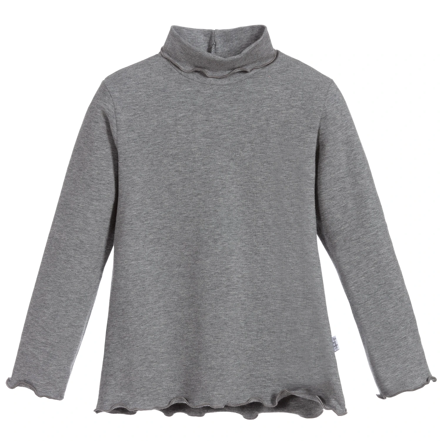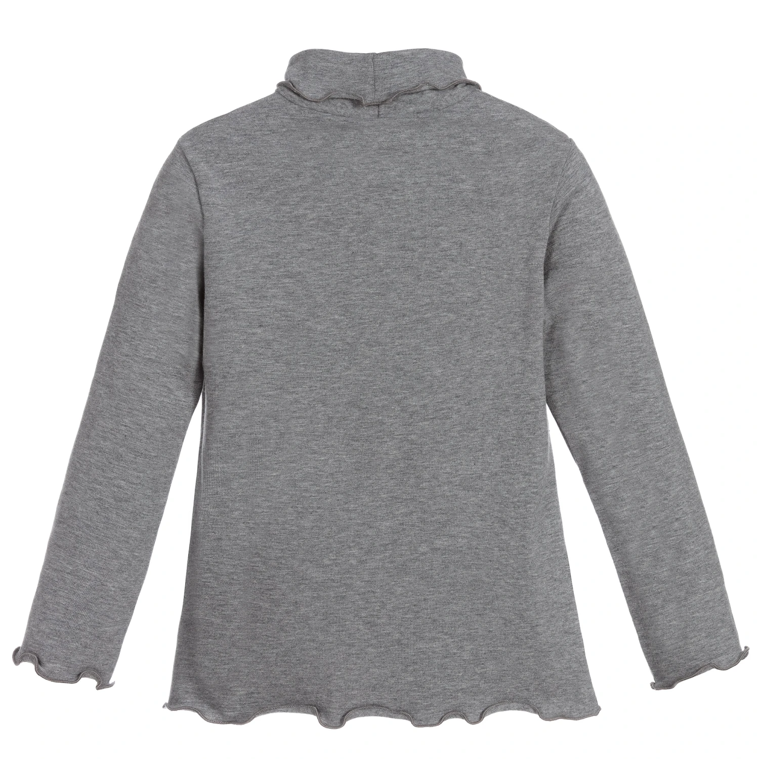 Grey marl roll neck for girls by Il Gufo, made in soft and stretchy cotton jersey, with pretty ruffle trims on the neck, cuffs and hem.