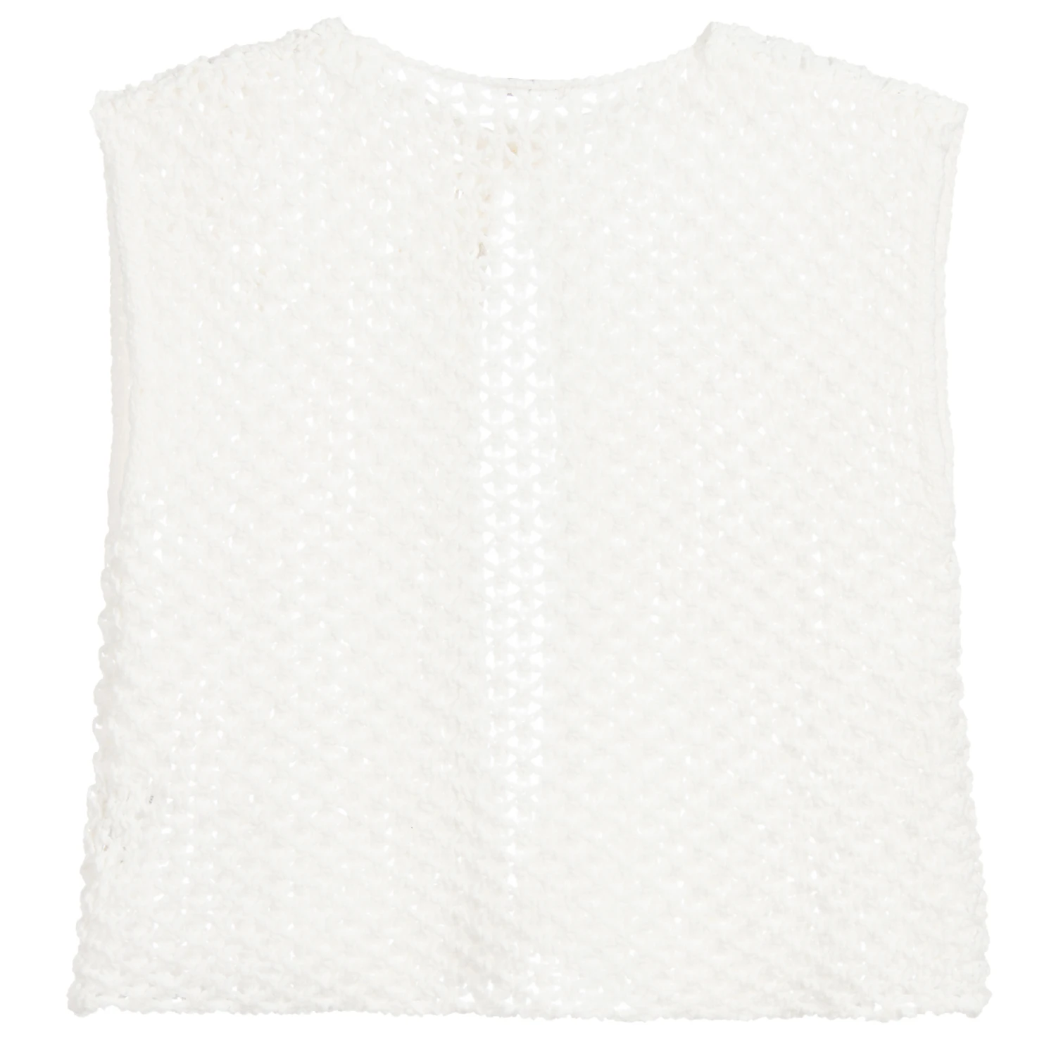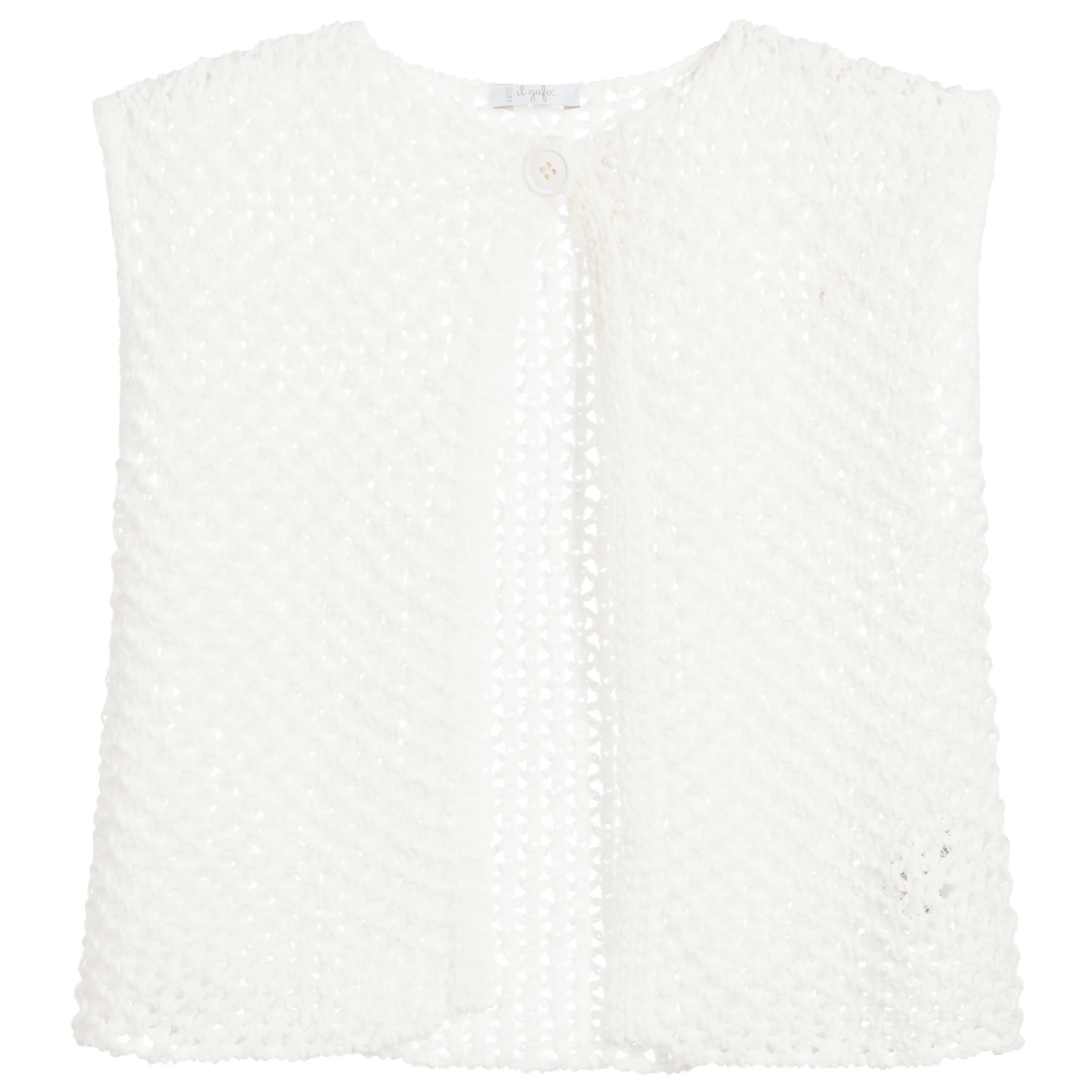 A pretty ivory sleeveless crochet cardigan for girls by Il Gufo. Made in a soft cotton and polyamide blend yarn, with a lacy stitch and a button fastening on the neck.