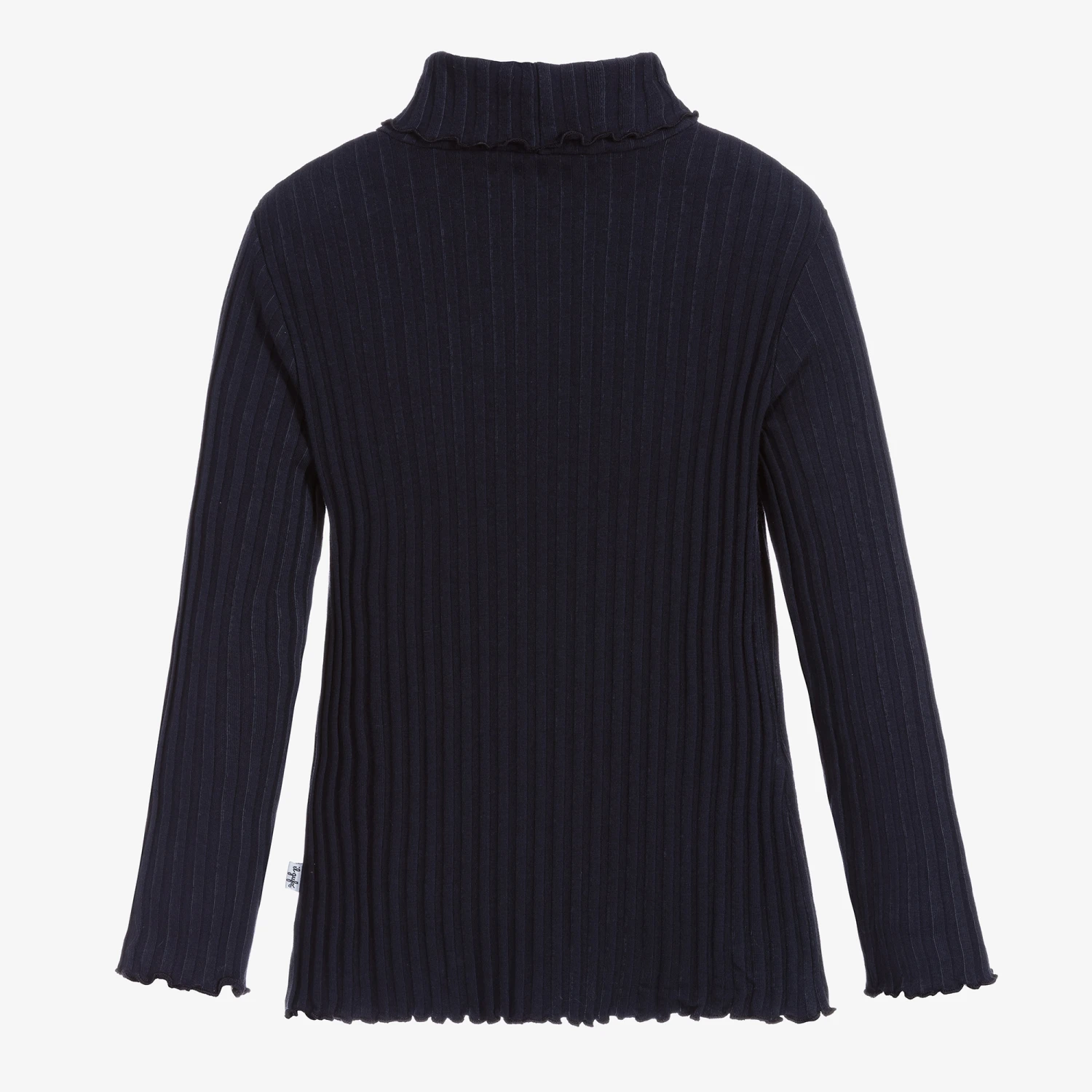 Girls navy blue, ribbed roll neck top by Il Gufo. Made in luxury soft, lightweight cotton jersey, it has ruffled trim on the collar, cuffs and hem.