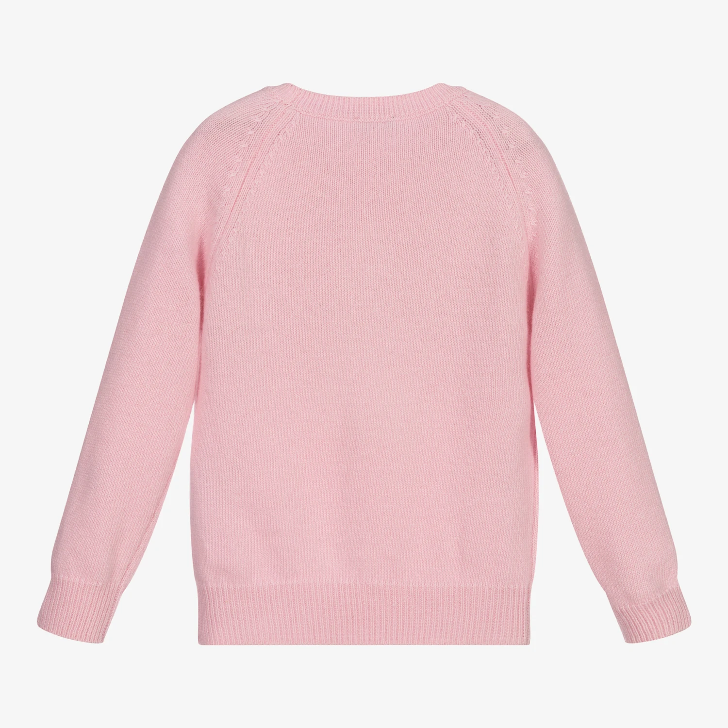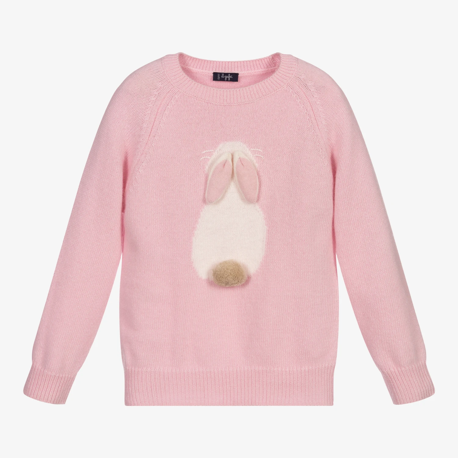 Pale pink sweater for girls by luxury brand Il Gufo, knitted in super soft virgin wool. It has a cute bunny motif on the front in ivory, brown and pink.