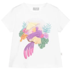 White T-shirt for girls by luxury brand Il Gufo. Made in comfortable cotton jersey, it has a colourful parrot printed on the front, with a yellow appliqué umbrella and grass skirt.