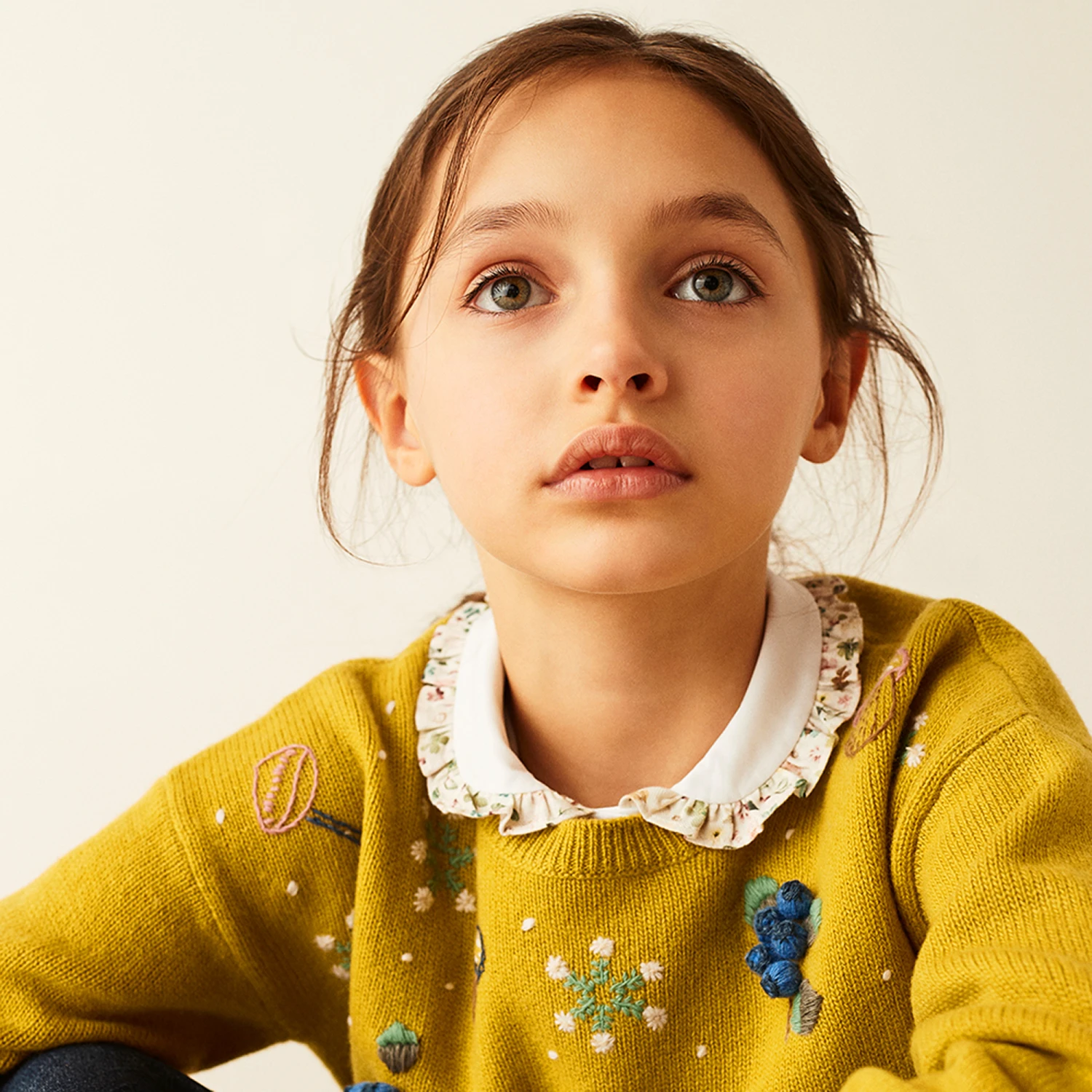 Dark mustard yellow sweater for girls by Italian luxury brand, Il Gufo. Made from soft knitted virgin wool, it has cute embroidered mushrooms, with appliqué blueberries on the front.