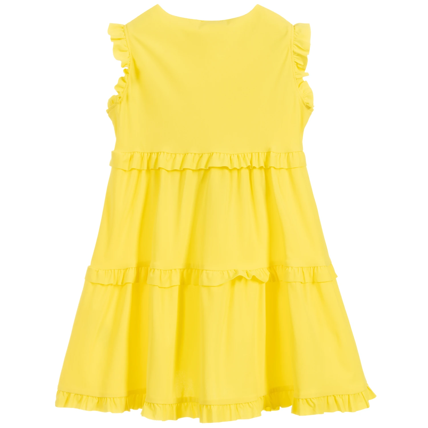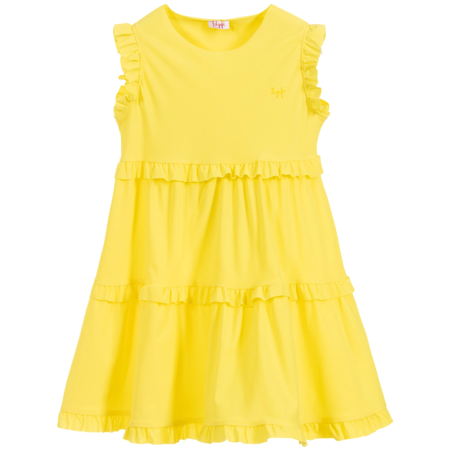 A bright yellow tiered frilled dress for girls by Il Gufo. Stretchy, lightweight and silky, it is made in ‘Technical Sensitive®’ fabric, developed to be comfortable, breathable, easy to care for and wrinkle-free.