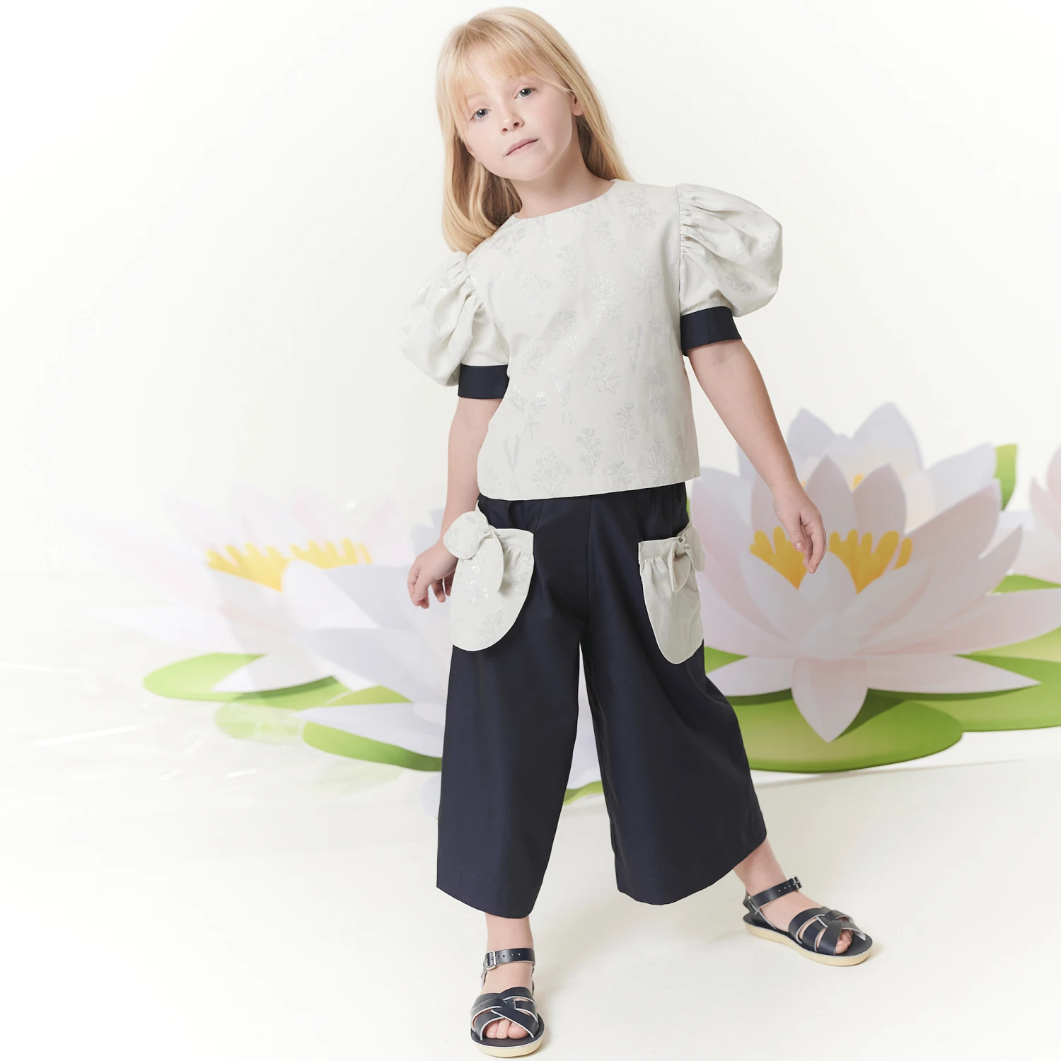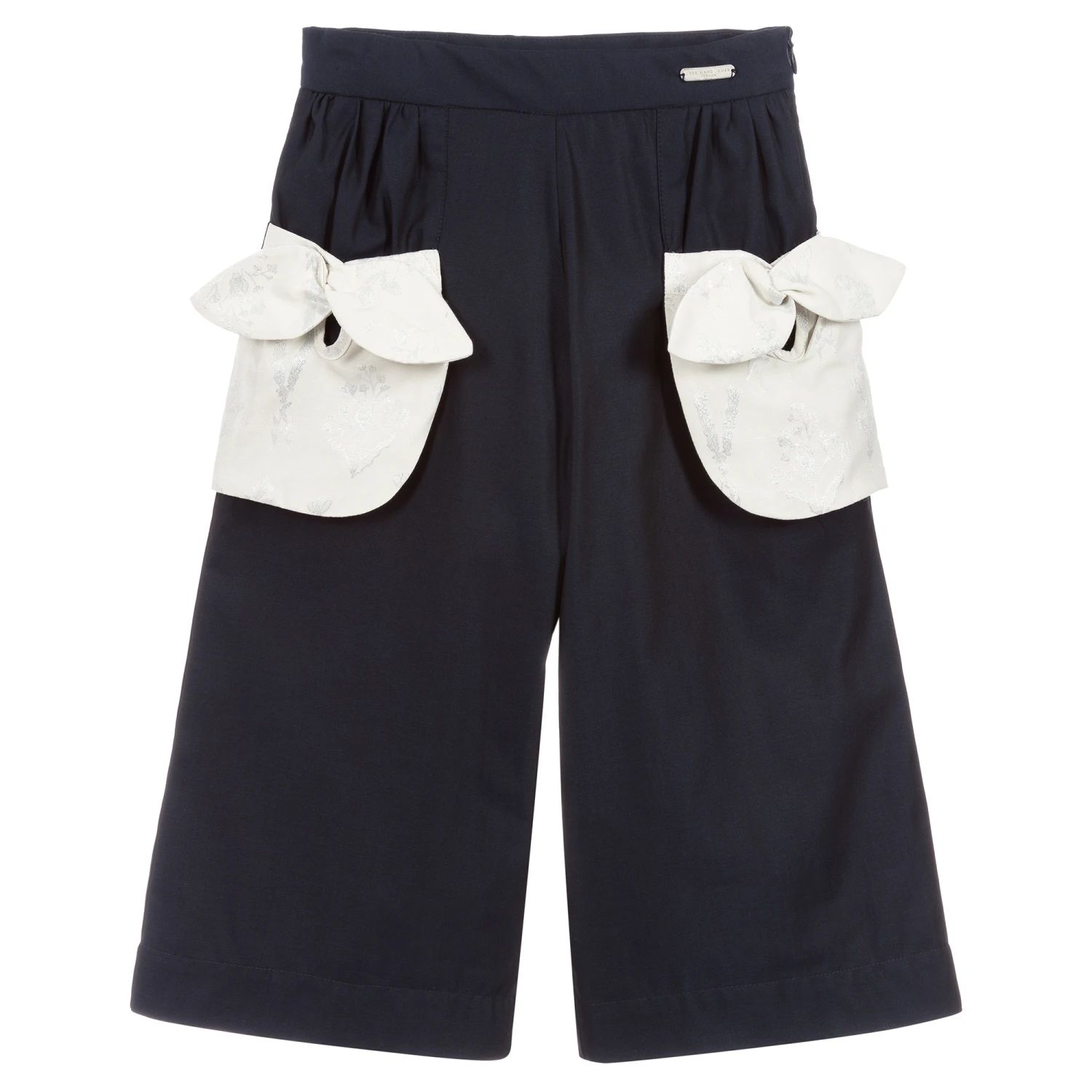 Navy blue, wide-leg trousers for girls by Jessie and James London. They are made in soft cotton twill and have a lightweight cotton lining. They have ivory and silver jacquard pockets on the front, with an adjustable waistband and side zip fastening.