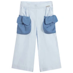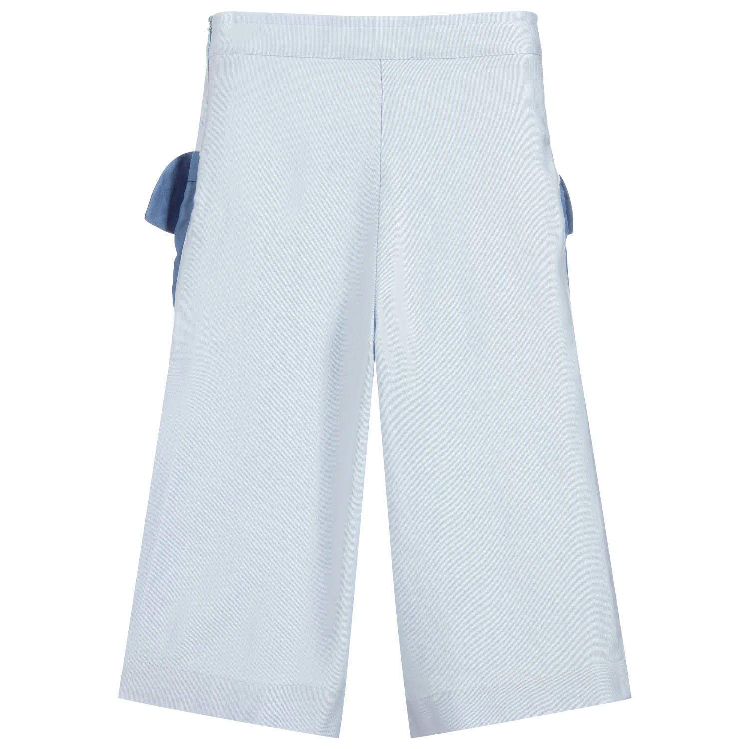 Girls pale blue smart wide leg trousers by Jessie and James London, with pretty blue pocket details on the front. They are fully lined and have a side zip fastening.