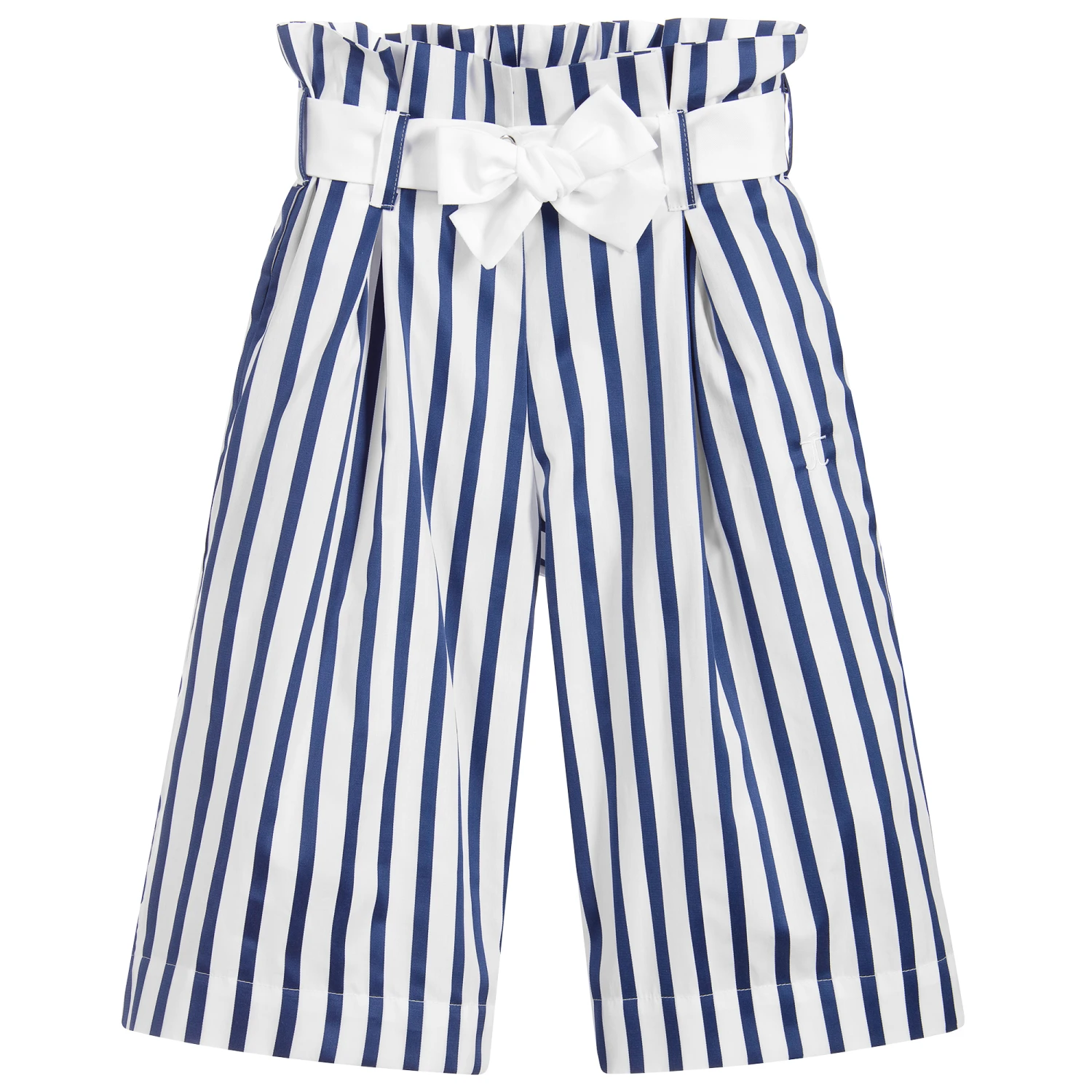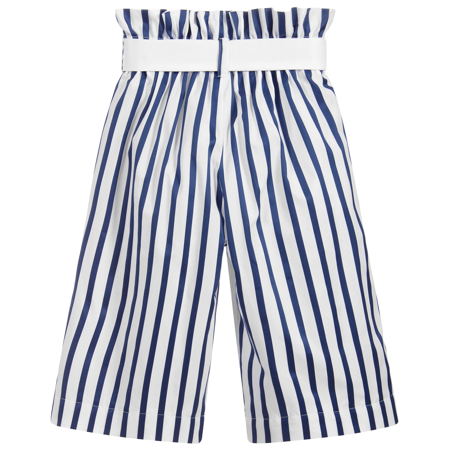 Girls blue and white striped culottes by Jessie and James London. They have wide legs and an elasticated ‘paper-bag’ waistline with a white fabric belt to tie in a bow. They are made in lightweight cotton and have pockets in the hip seams and are fully lined in soft, lightweight cotton.