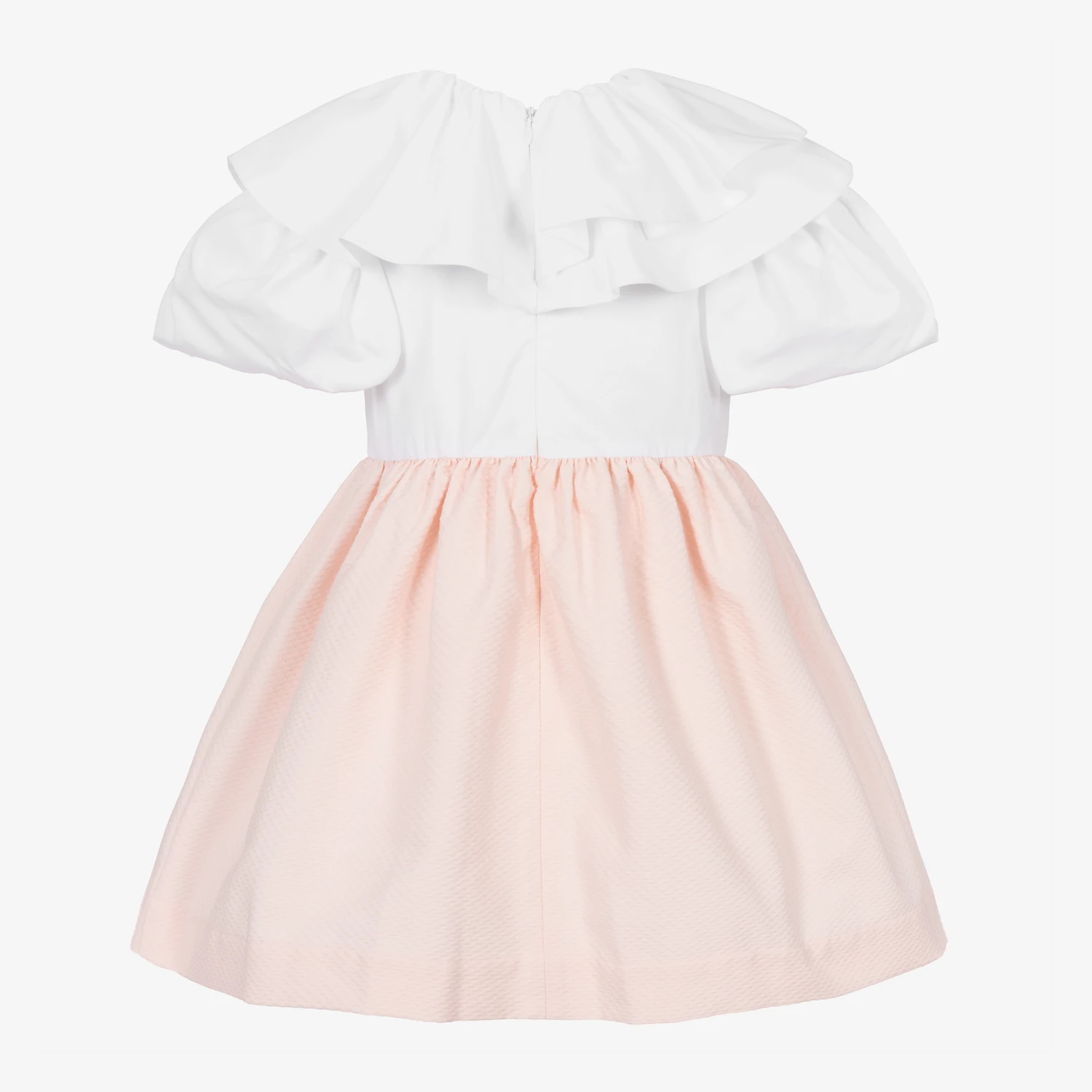In white and pale pink, this beautiful dress for girls is by Jessie and James London. Made in lightweight twill with large puffed sleeves, the bodice has oversized ruffles and a stand-out flower design on the front. The woven skirt has a softly textured pattern and is gathered at the waist for a voluminous effect. Fully lined in lightweight cotton voile for comfort, the dress fastens discreetly with a concealed zip on the back