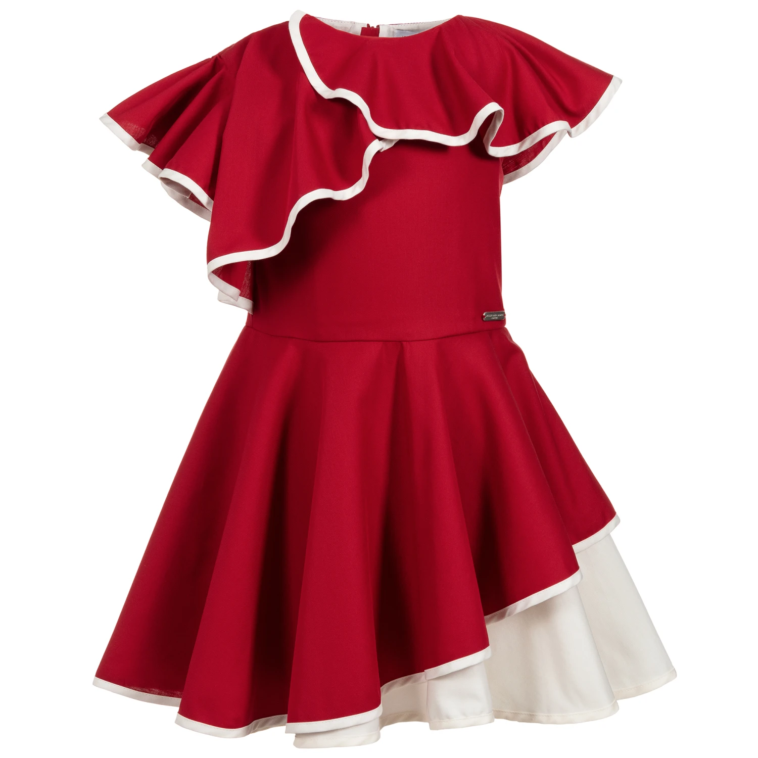 A beautiful dark red, ruffled cotton dress for girls by Jessie and James London. It has a pretty asymmetric styled bodice, with a sleeve on one arm and a ruffle on the other. There is smart ivory trim and a matching petticoat that shows beneath on one side.
