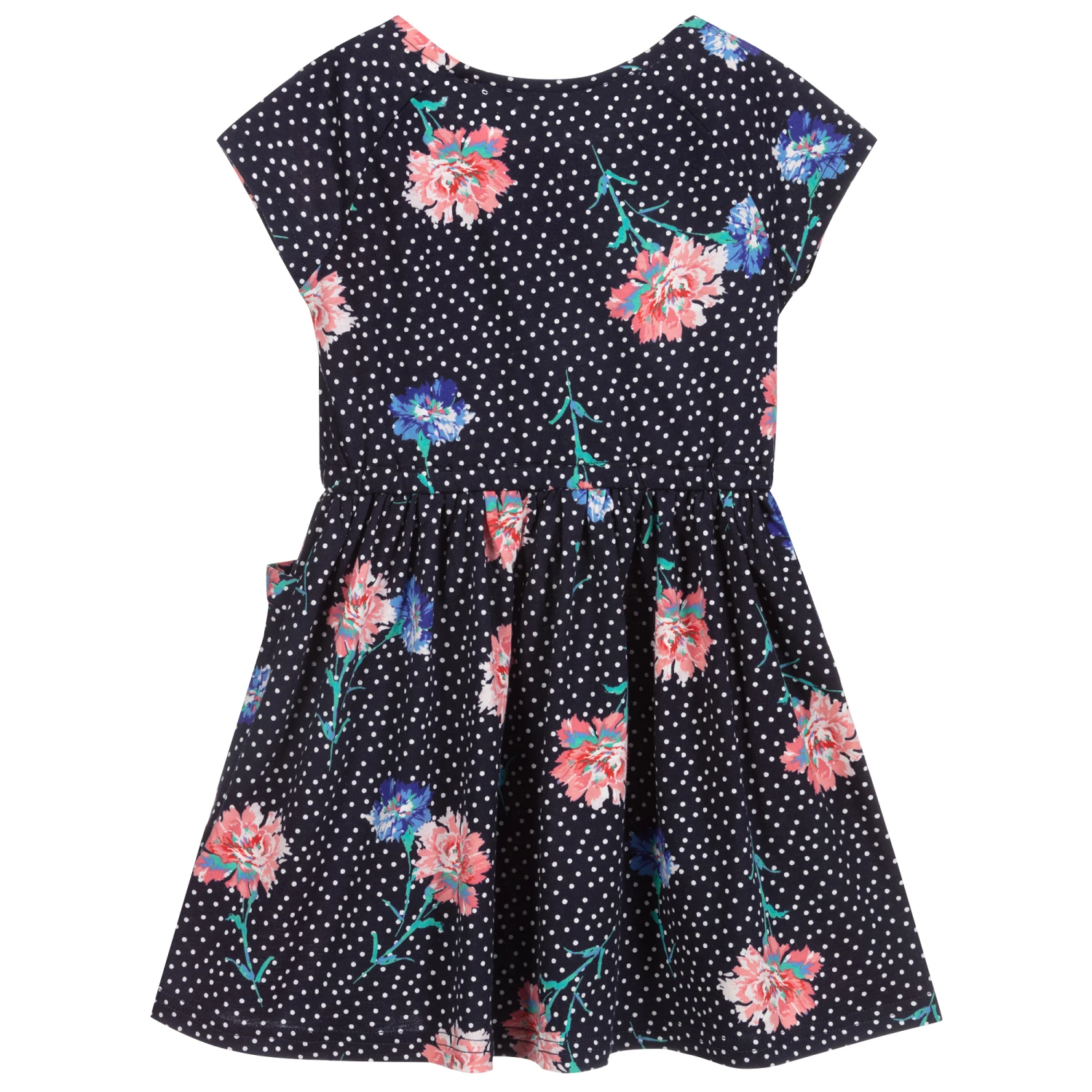 Girls navy blue polka dot dress by British designer Joules. Made in soft cotton, it has a pink and blue floral pattern with an elasticated waistband for comfort.