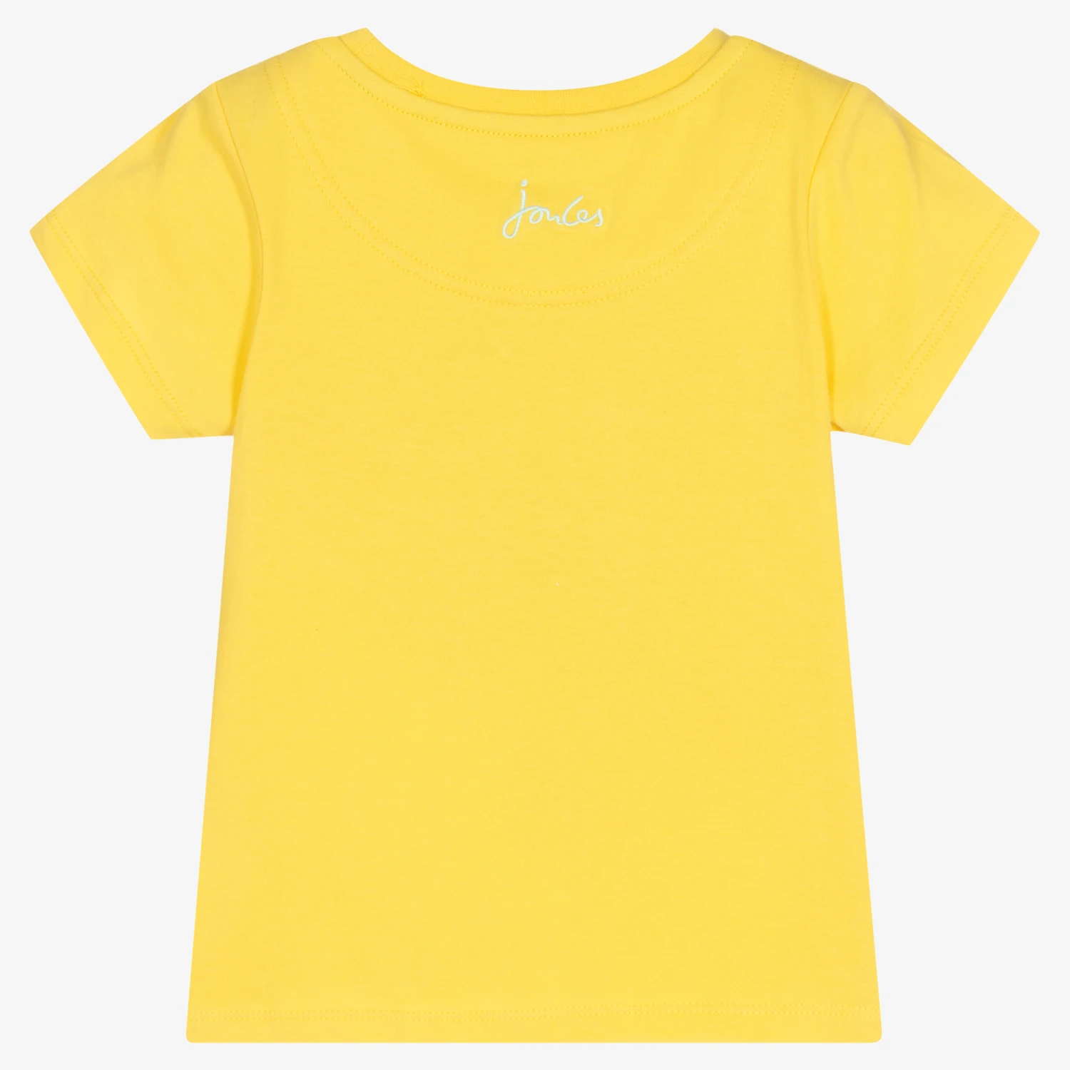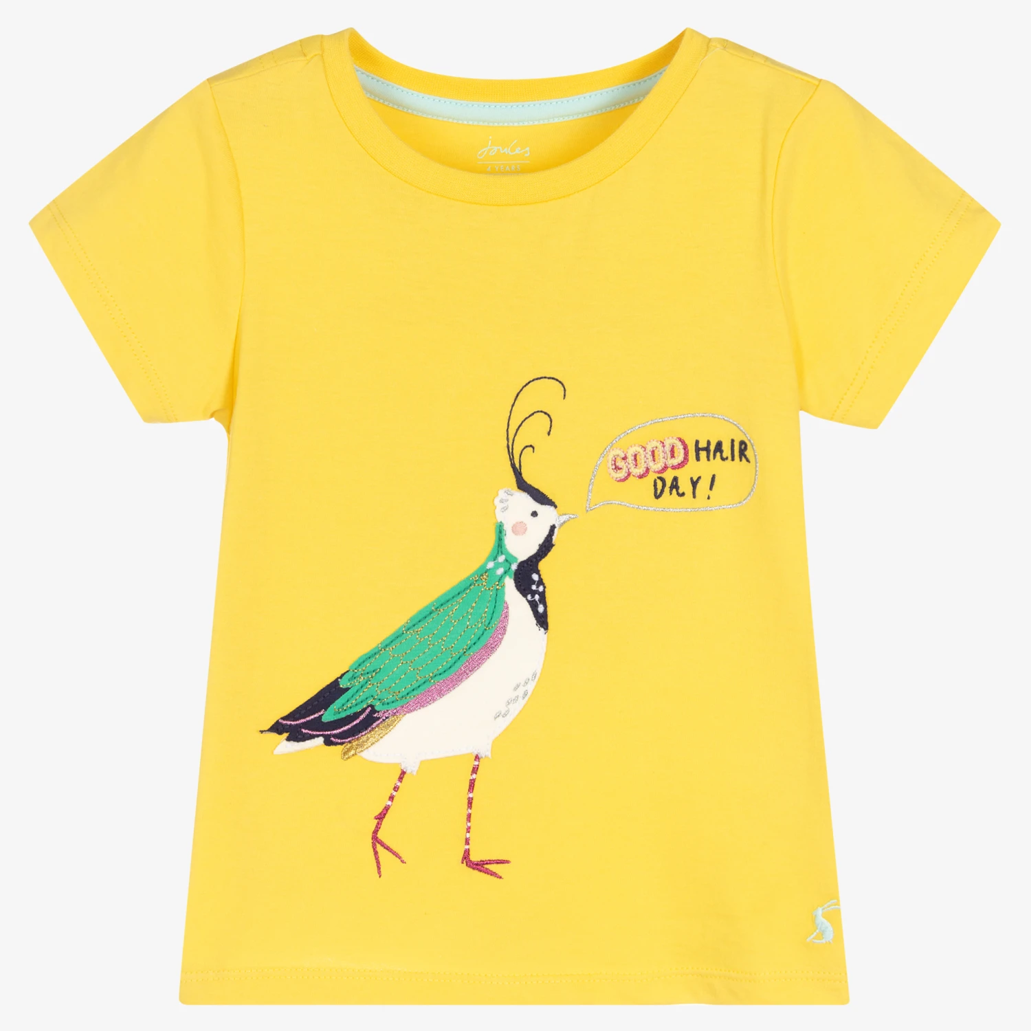 Bright yellow T-shirt for girls by British brand Joules, made in soft and stretchy cotton jersey. It has a striking bird appliqué on the front, designed in partnership with the RSPB. The brand’s iconic hare logo is embroidered in pale blue by the hem and there is a pale blue logo embroidered on the back.