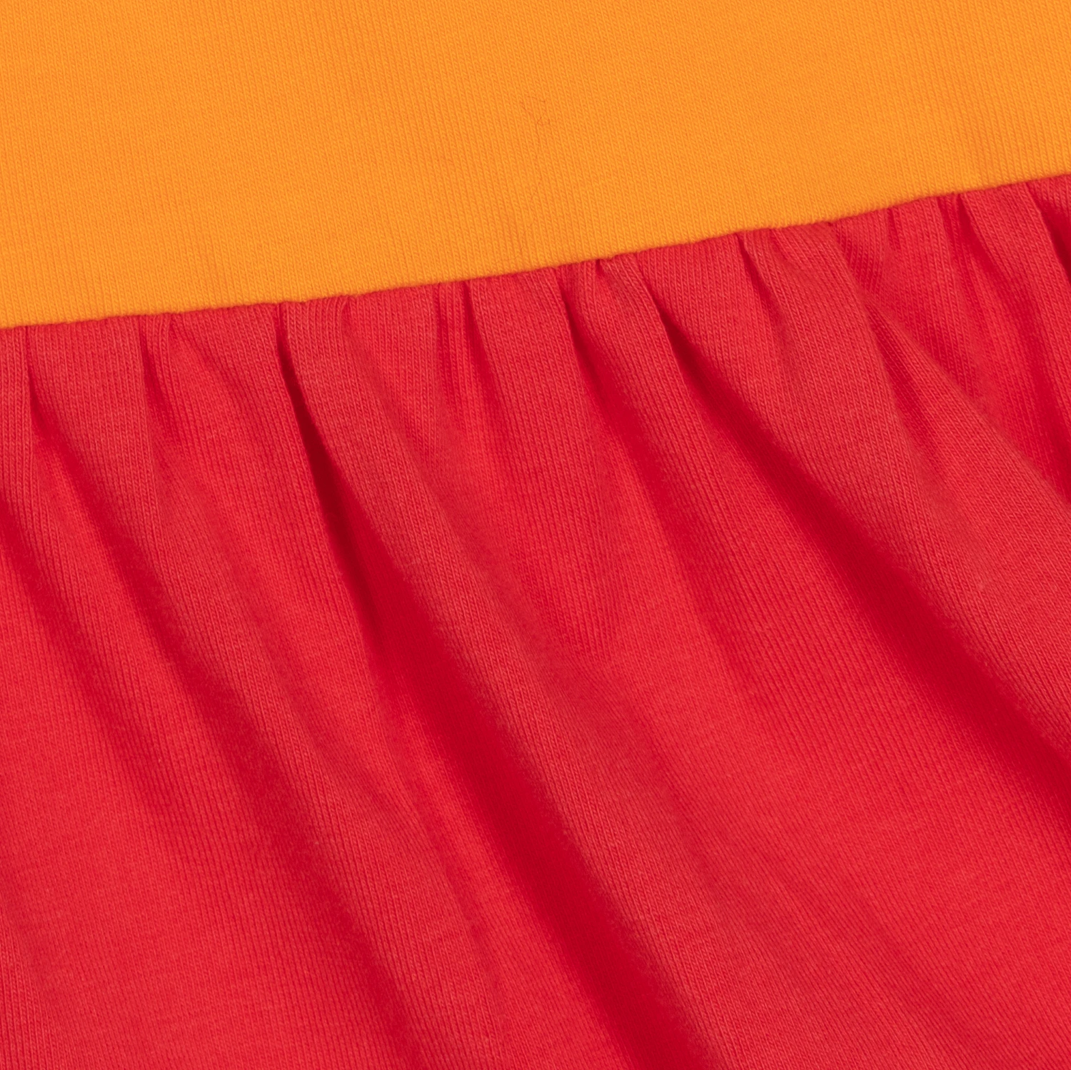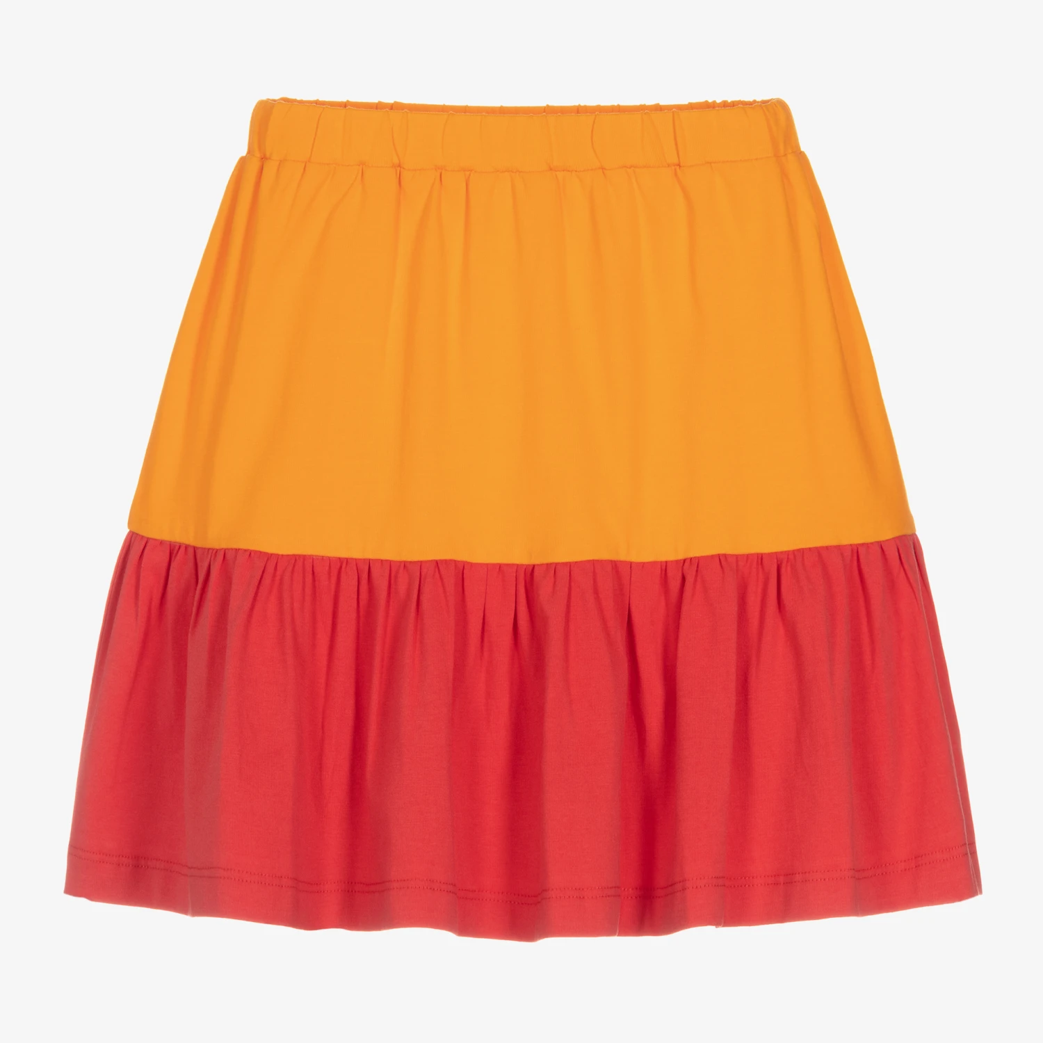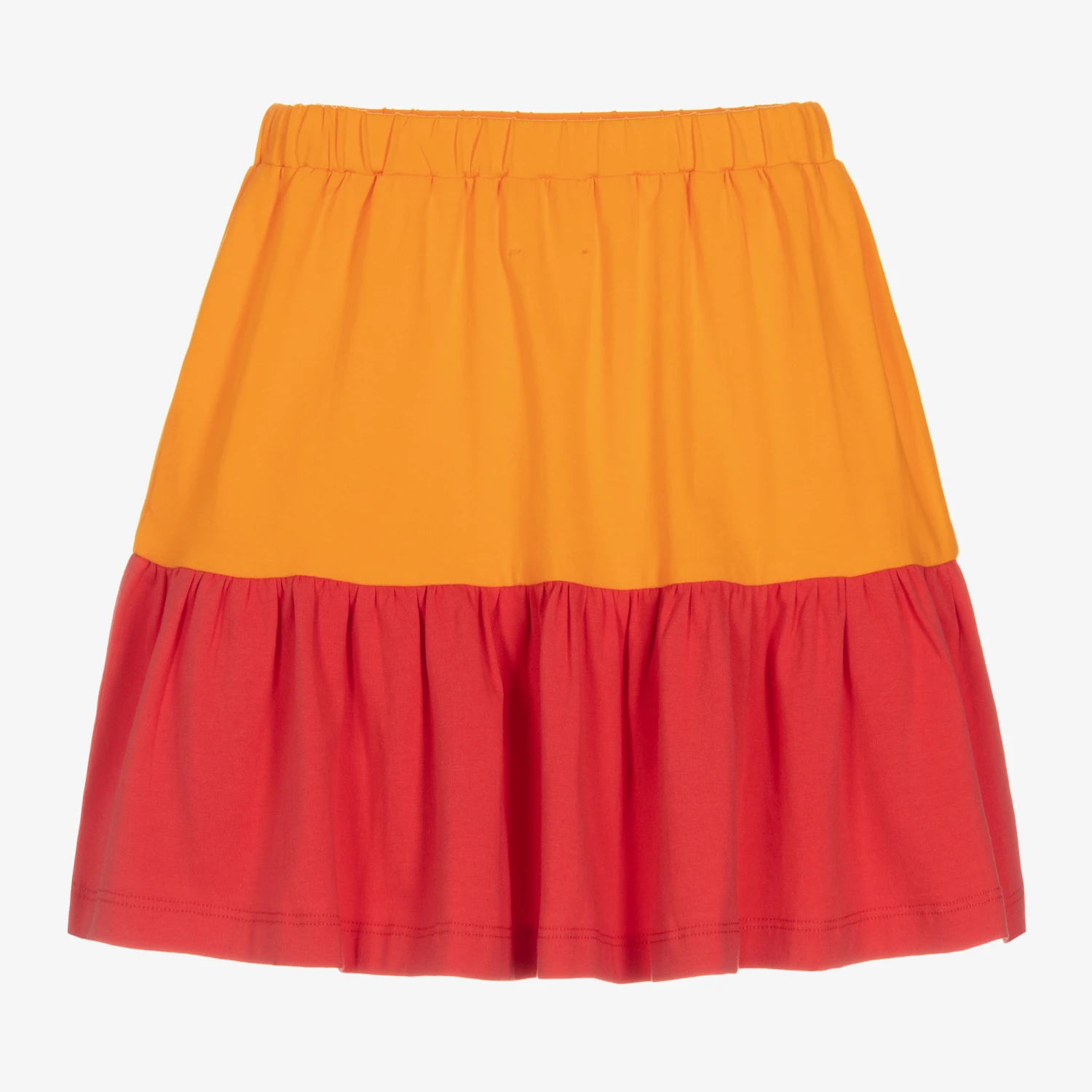 Colourful, casual cotton skirt for girls by Joyday, exclusive to Childrensalon and tiered in orange and red. Made in comfortable, lightweight jersey, it is gathered, full, and easy to wear, simply pulling up. It has an elasticated waistband to ensure a comfortable fit for little tummies.