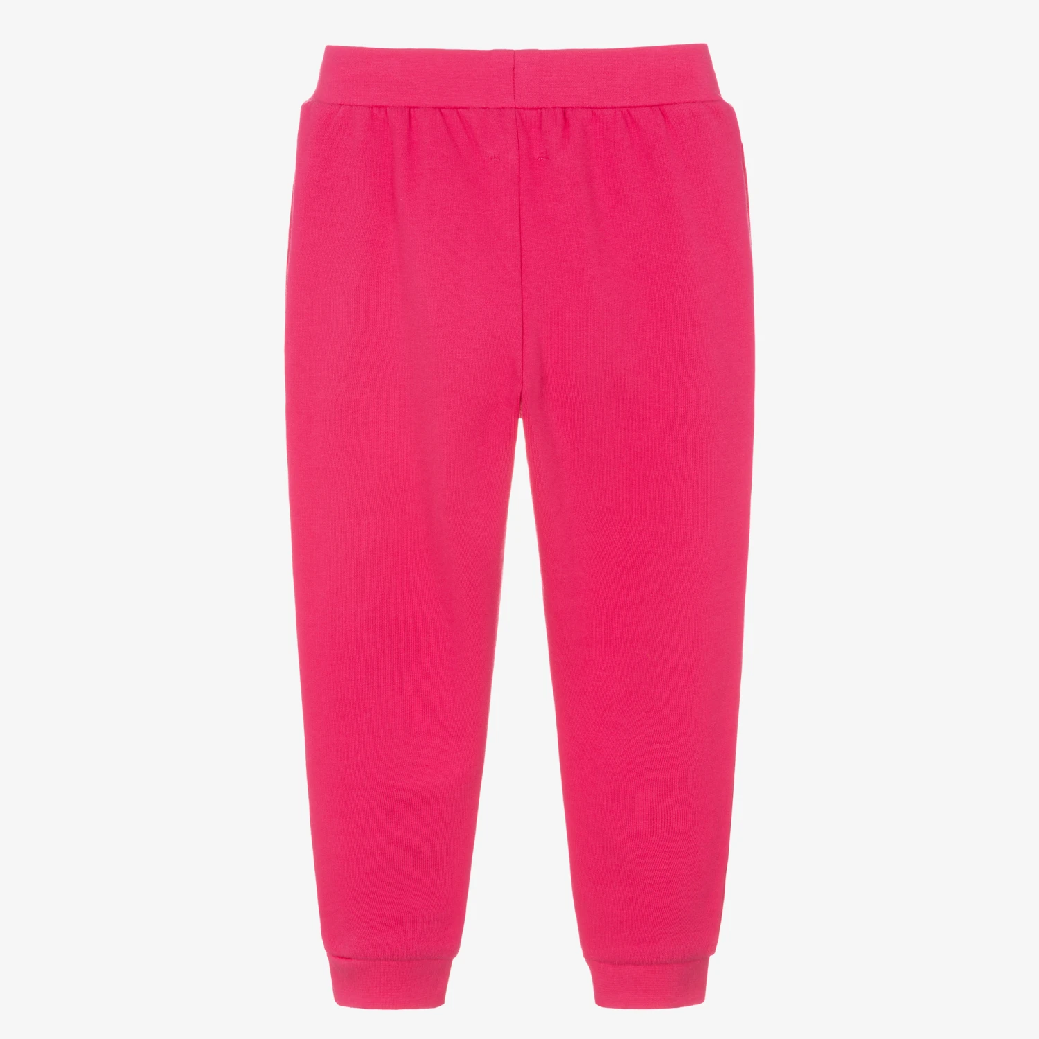 Exclusive to Childrensalon, a pair of fuchsia pink joggers for girls by Joyday. Ideal for laid-back lounging, they are made in comfortable cotton jersey with a warm, fleecy inside. They have a useful drawstring waistband for a good fit and neat, concealed pockets on the side seams.