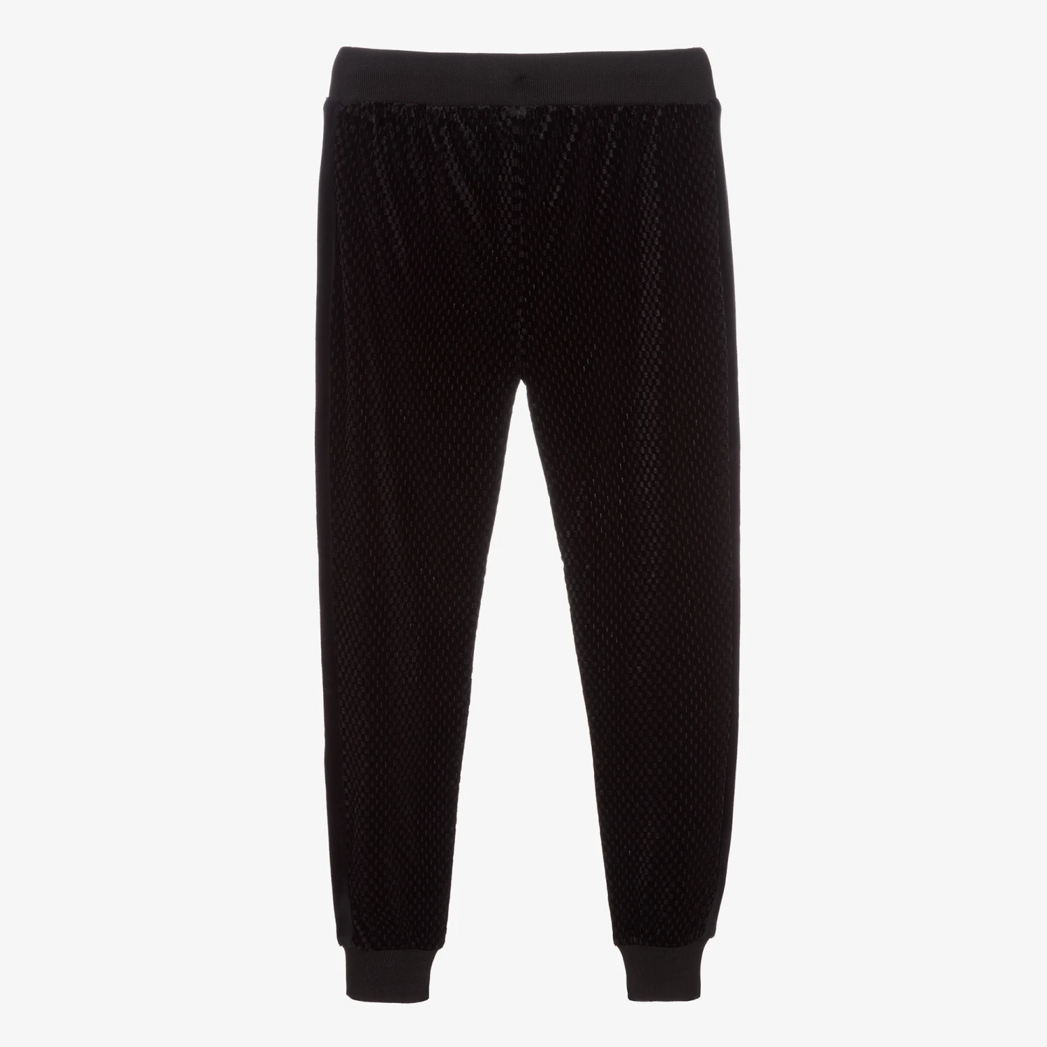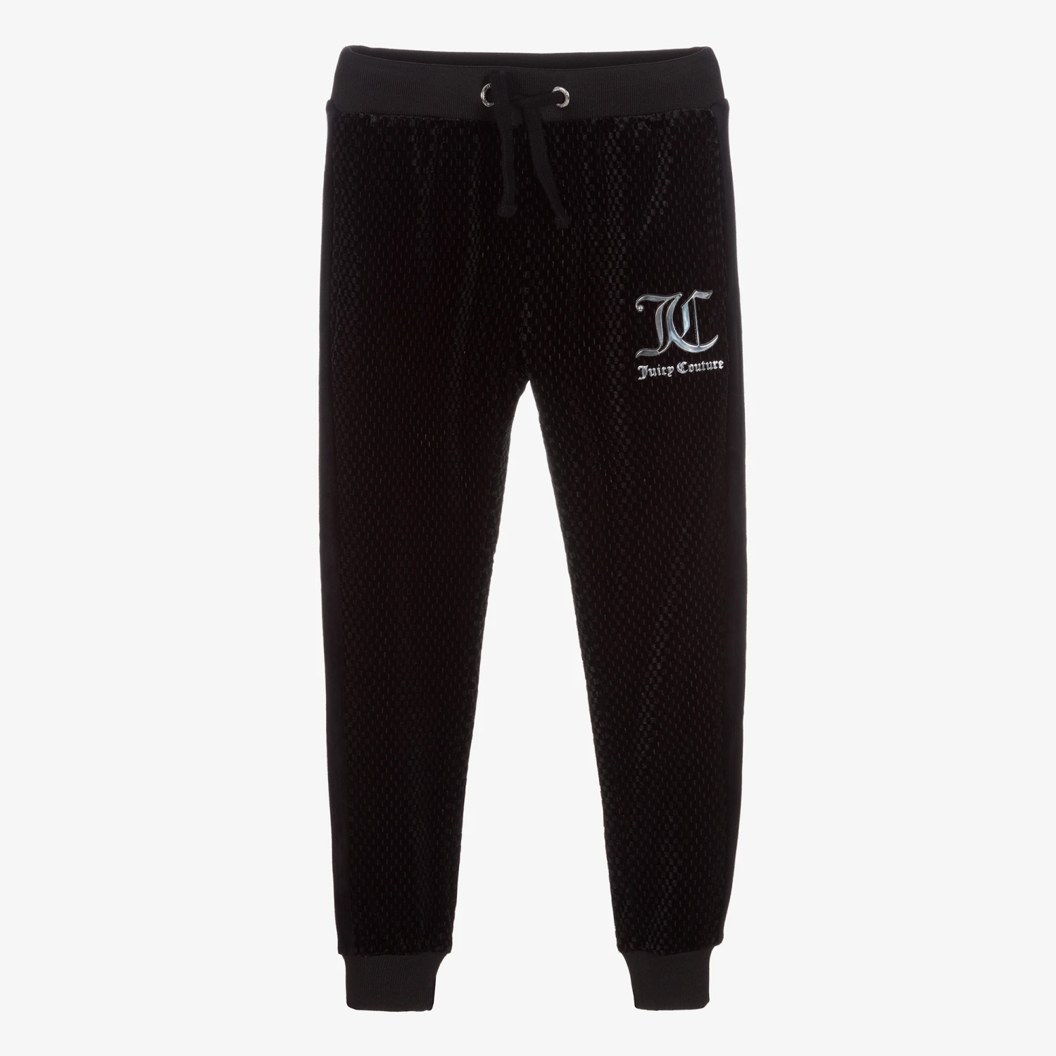 Comfortable black joggers for girls by Juicy Couture, made in soft textured velour with a check pattern. They have a stretchy ribbed waistband with a drawstring tie, concealed side pockets and an eye-catching rubberised silver logo on the front.