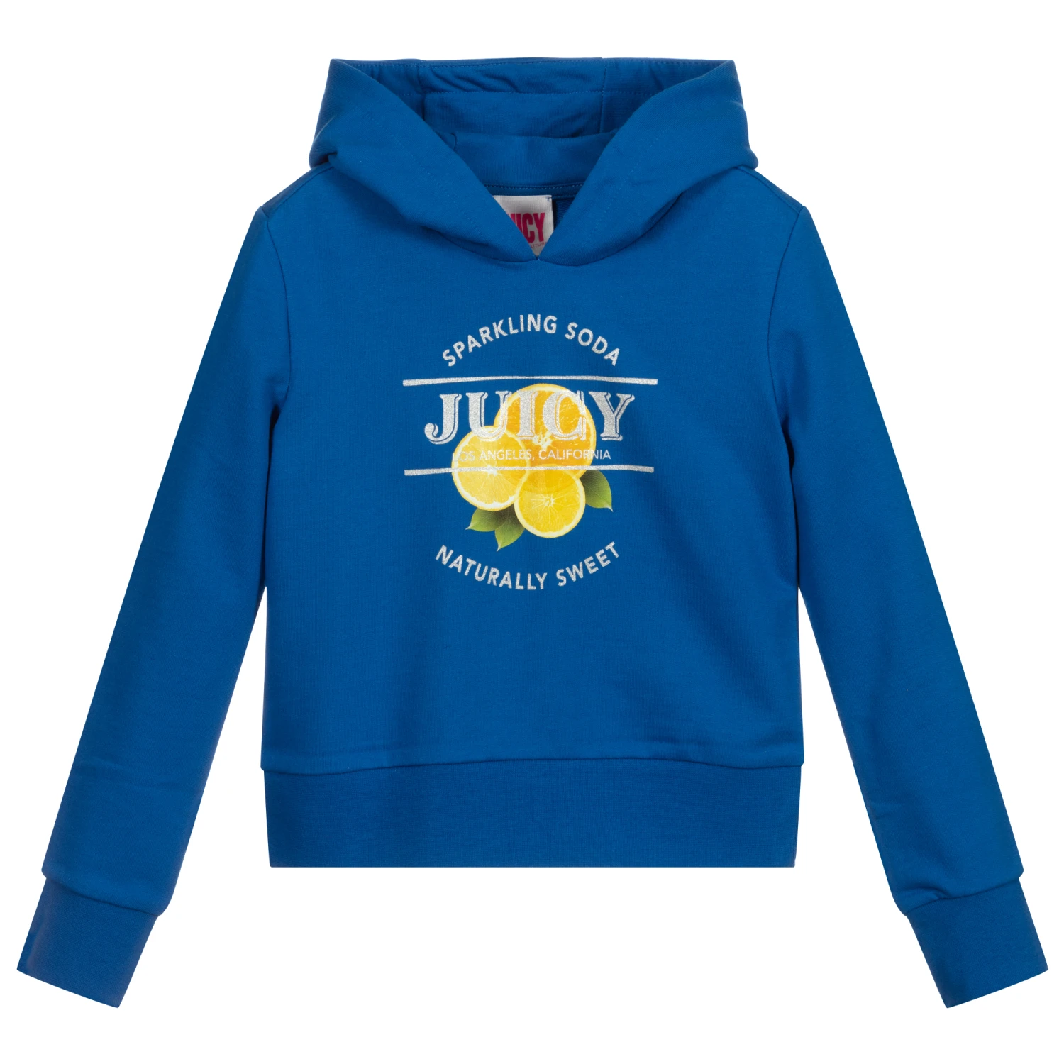Blue hooded sweatshirt for girls by American brand Juicy Couture. Made in comfortable cotton jersey, it has a shiny silver logo and slogan print across the chest with yellow lemons.