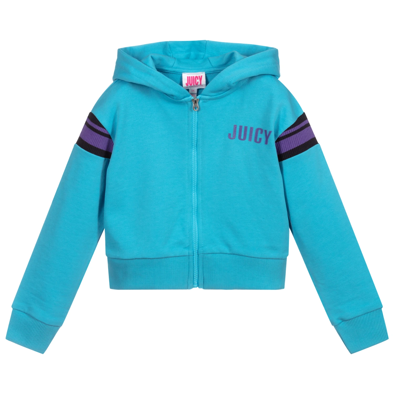 Turquoise blue cropped zip-up top by Juicy Couture, with a lined hood. Made in comfortable cotton jersey, it has the brand’s rubberised purple logo on the front and ribbed navy blue and purple stripes along the sleeves.