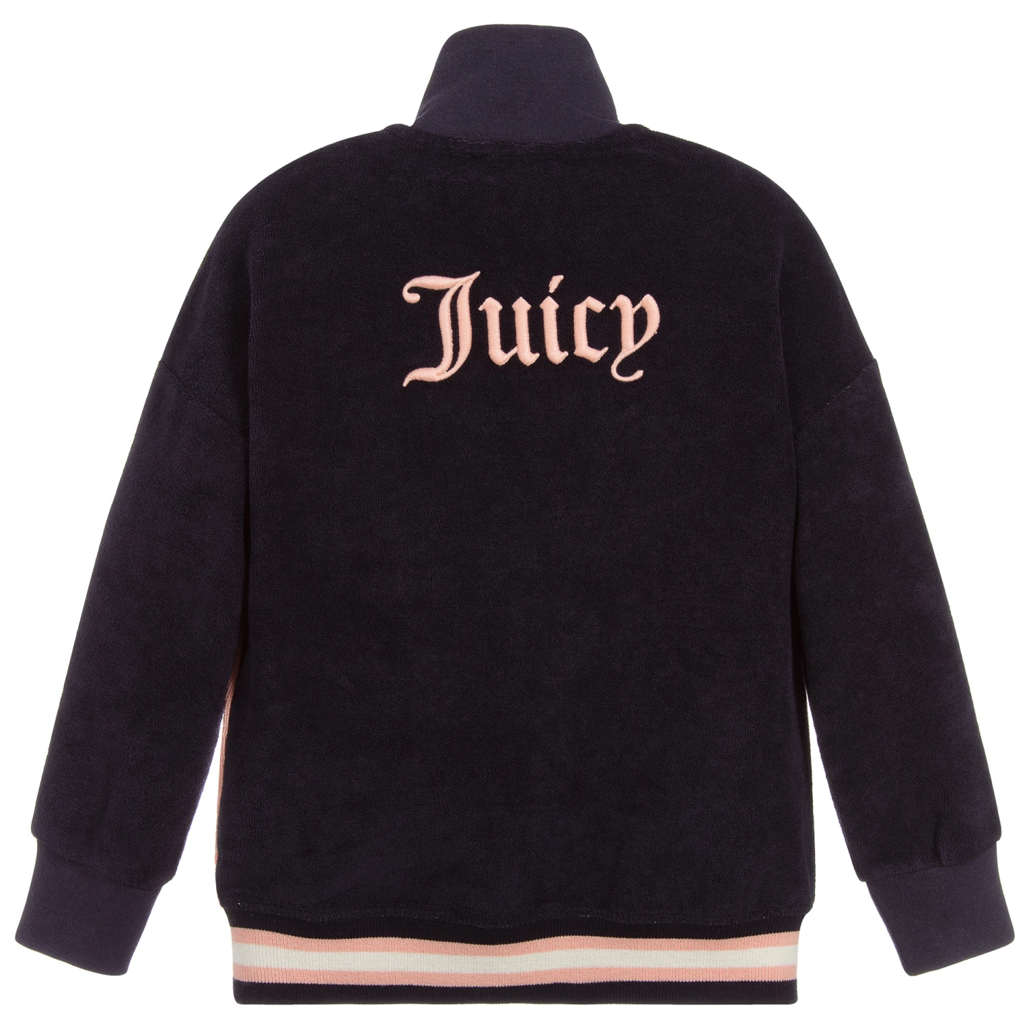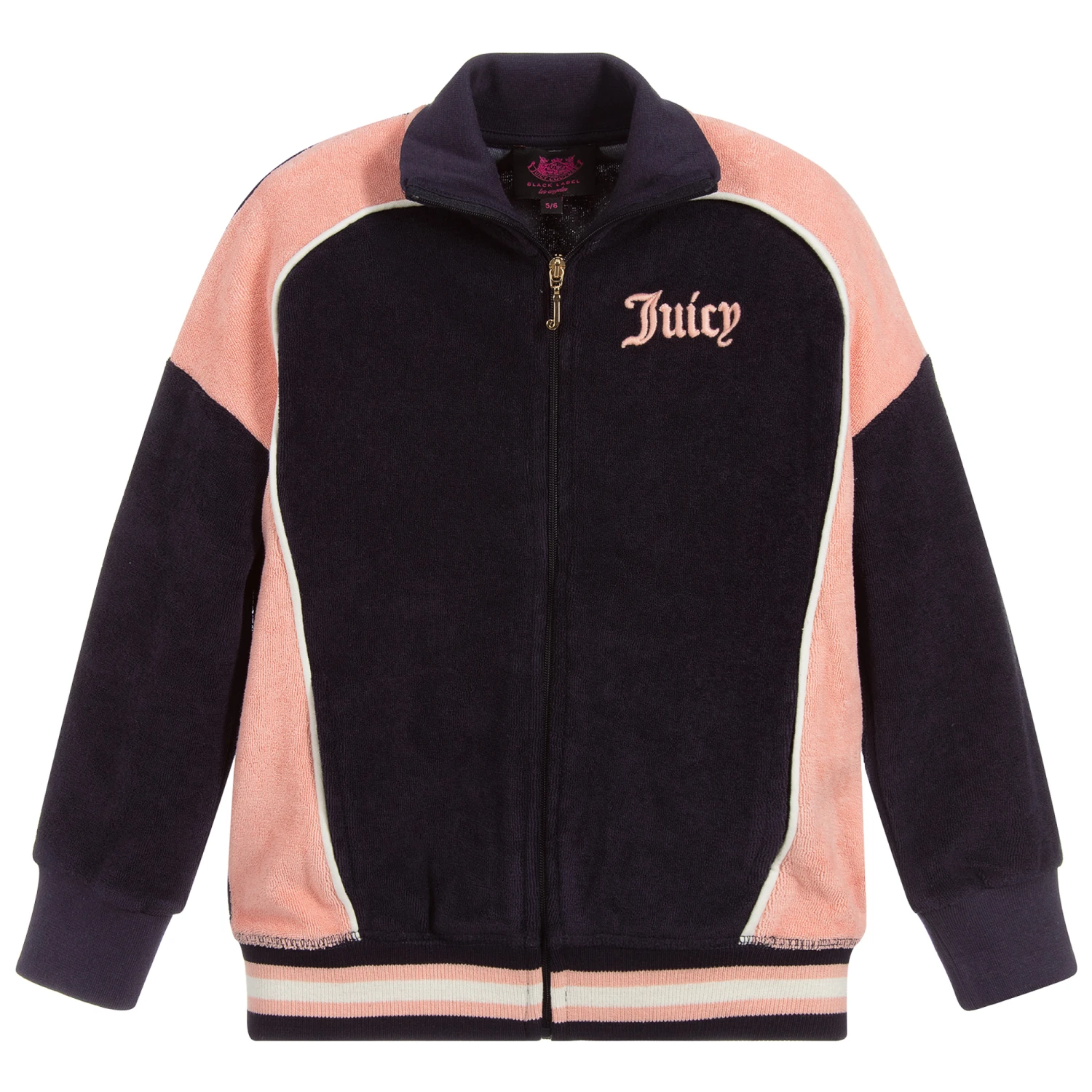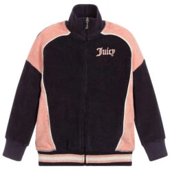 Pink and blue zip-up top for girls by Juicy Couture, made in soft cotton terry. It has pink logo embroidery on the chest.