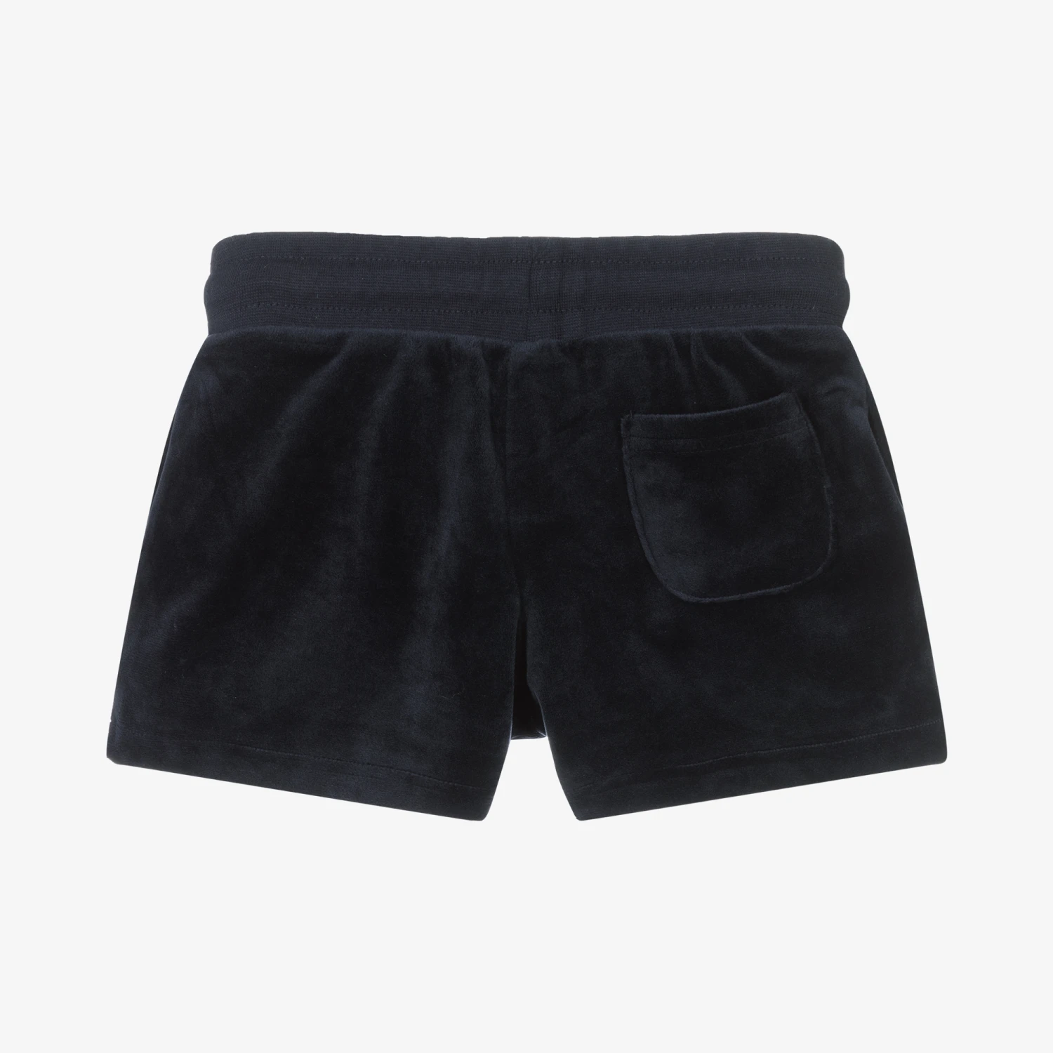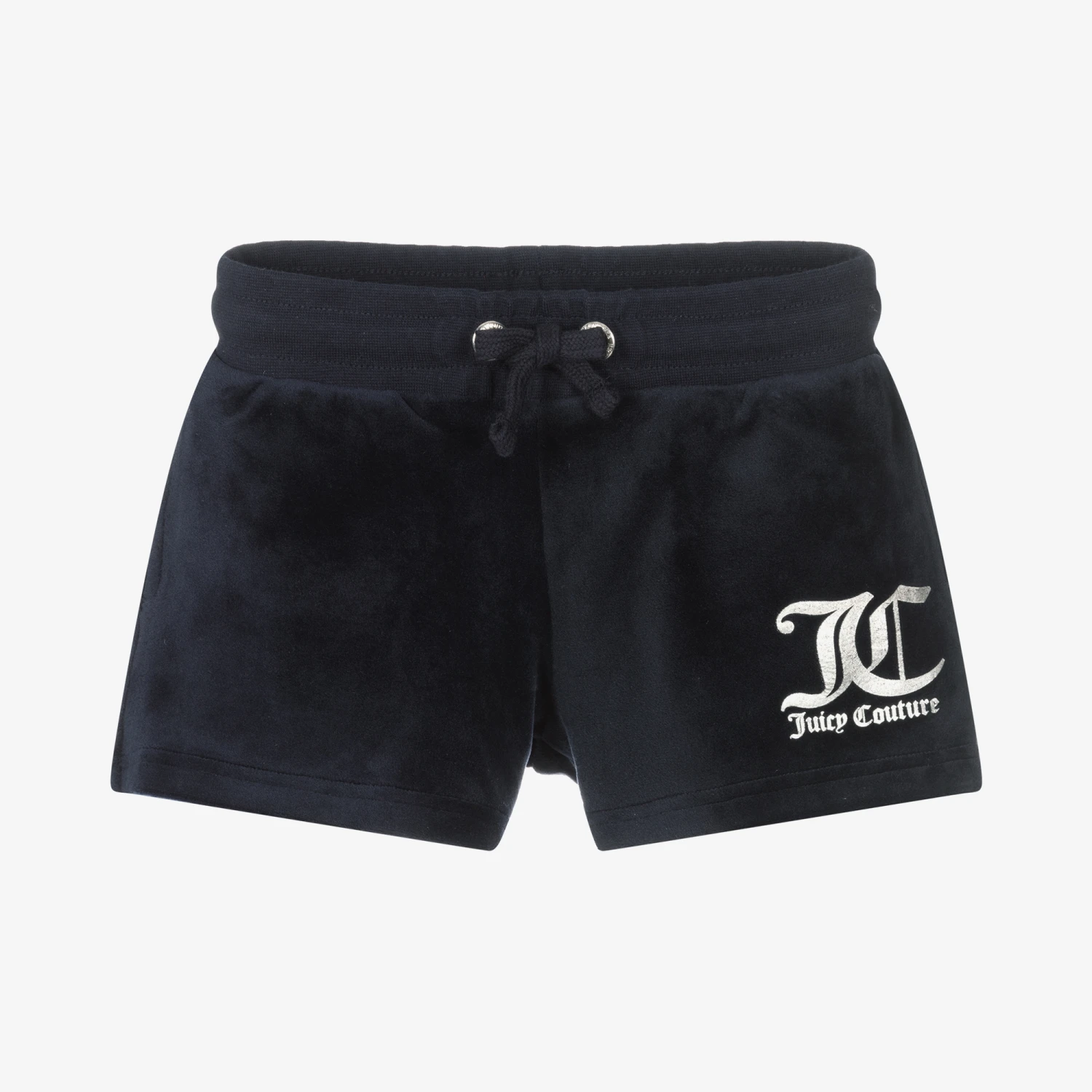 Comfortable navy blue shorts for girls by Juicy Couture, made in velvety soft velour. They have a bold metallic silver logo print on one leg, with concealed side seam pockets and a patch pocket on the back. The elasticated waist has drawstring ties for a good fit.
