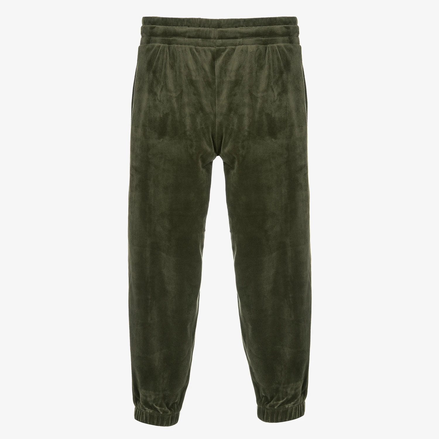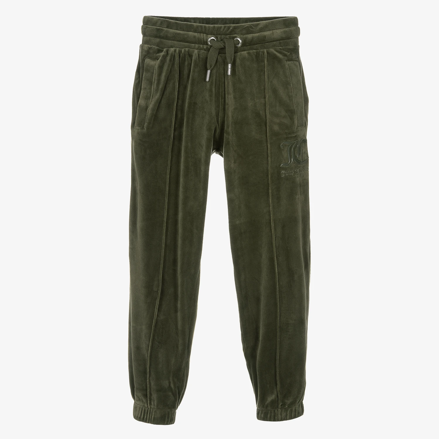 Casual khaki green joggers for girls by American designer Juicy Couture, made in soft velour with a jersey underside. Designed for leisure, they have a comfortable drawstring waist, pockets and elasticated cuffs. There is a tonal rubberised logo on the leg for a cool, modern twist.