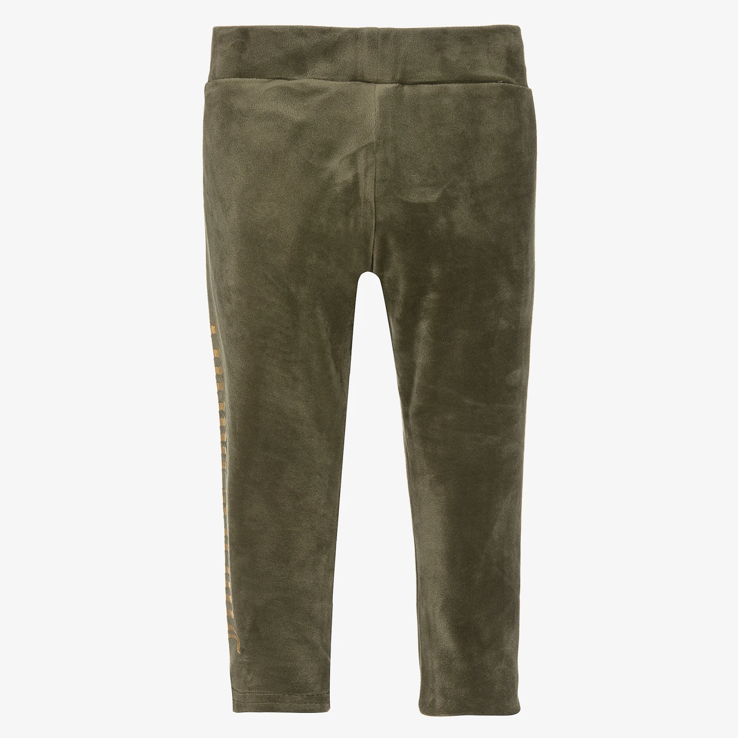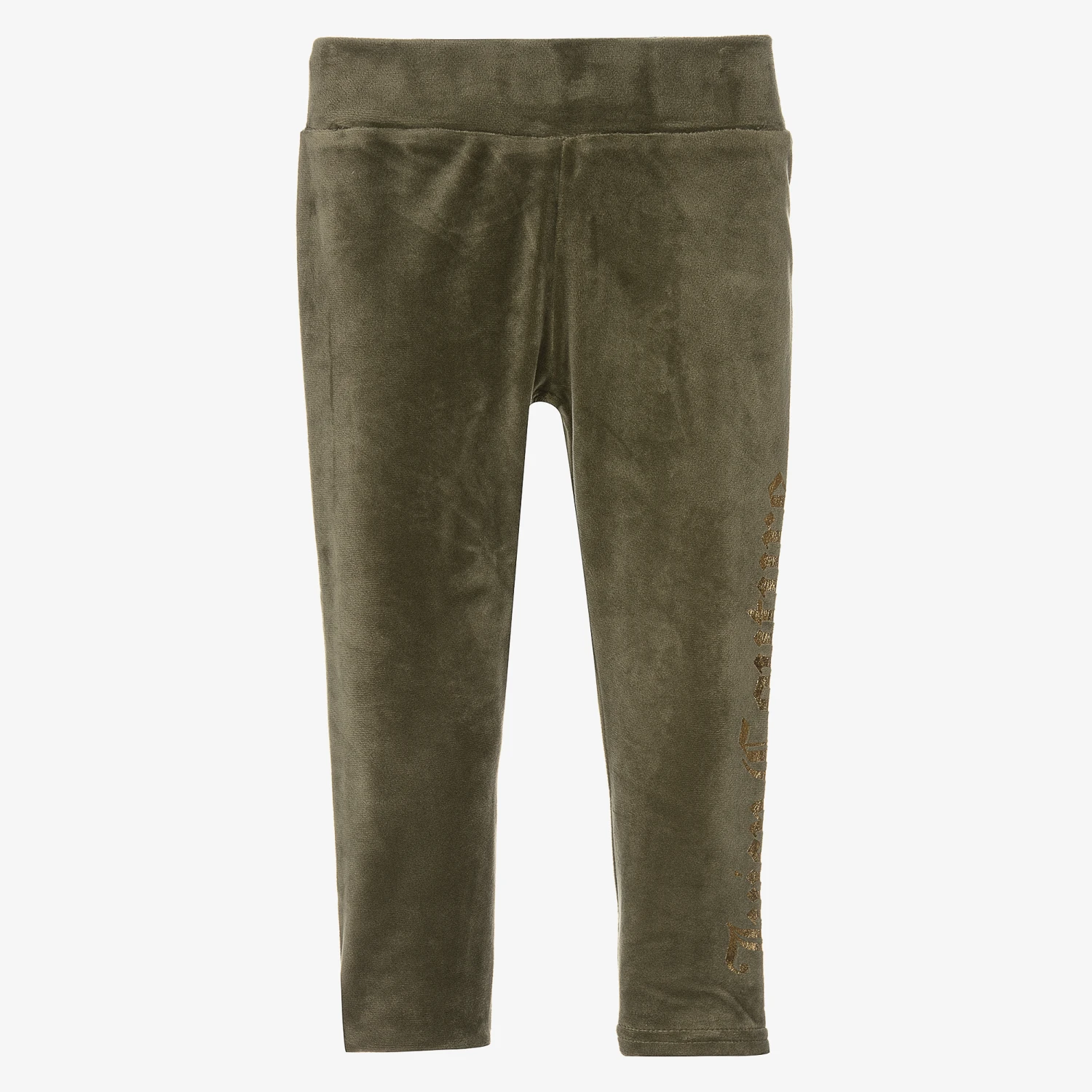 Khaki green leggings for girls by American designer Juicy Couture, made in soft velour with a jersey underside. Effortlessly chic, this casual piece has a gold foil logo on one leg and a comfortable elasticated waistband.