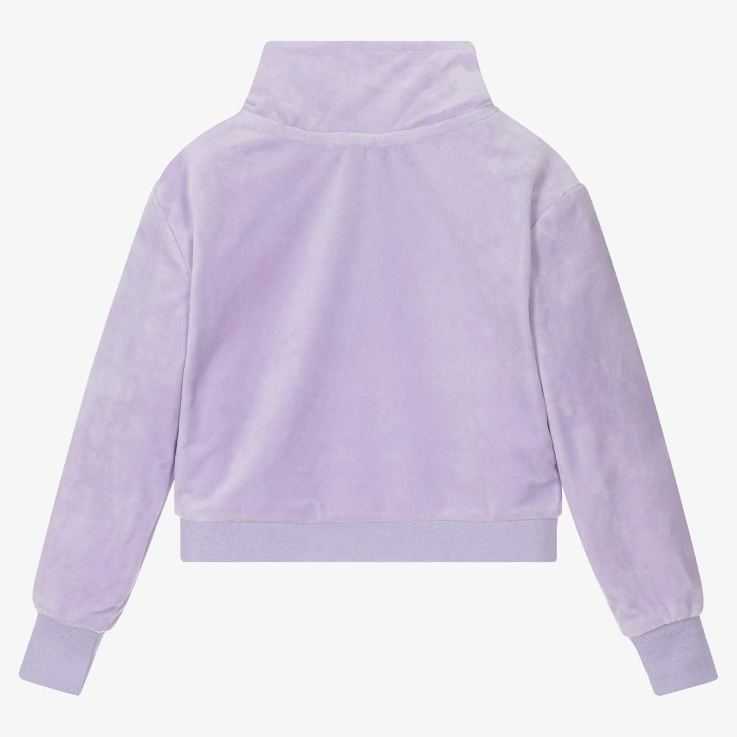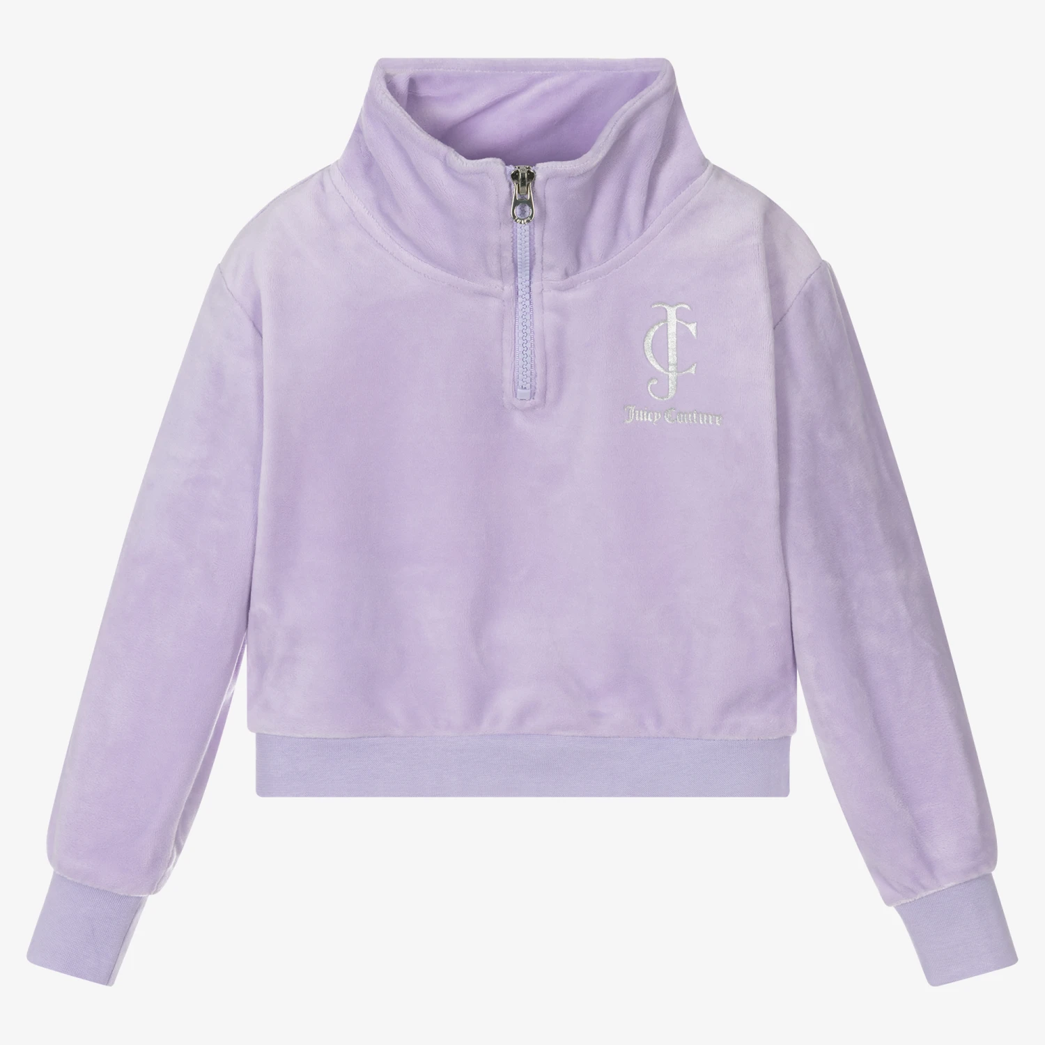 Casual velour top for girls by Juicy Couture, in a lovely lilac purple shade with a silver logo print on the chest. Super soft and stretchy, it has a slightly cropped length and a branded half zip fastening with a stand-up collar.