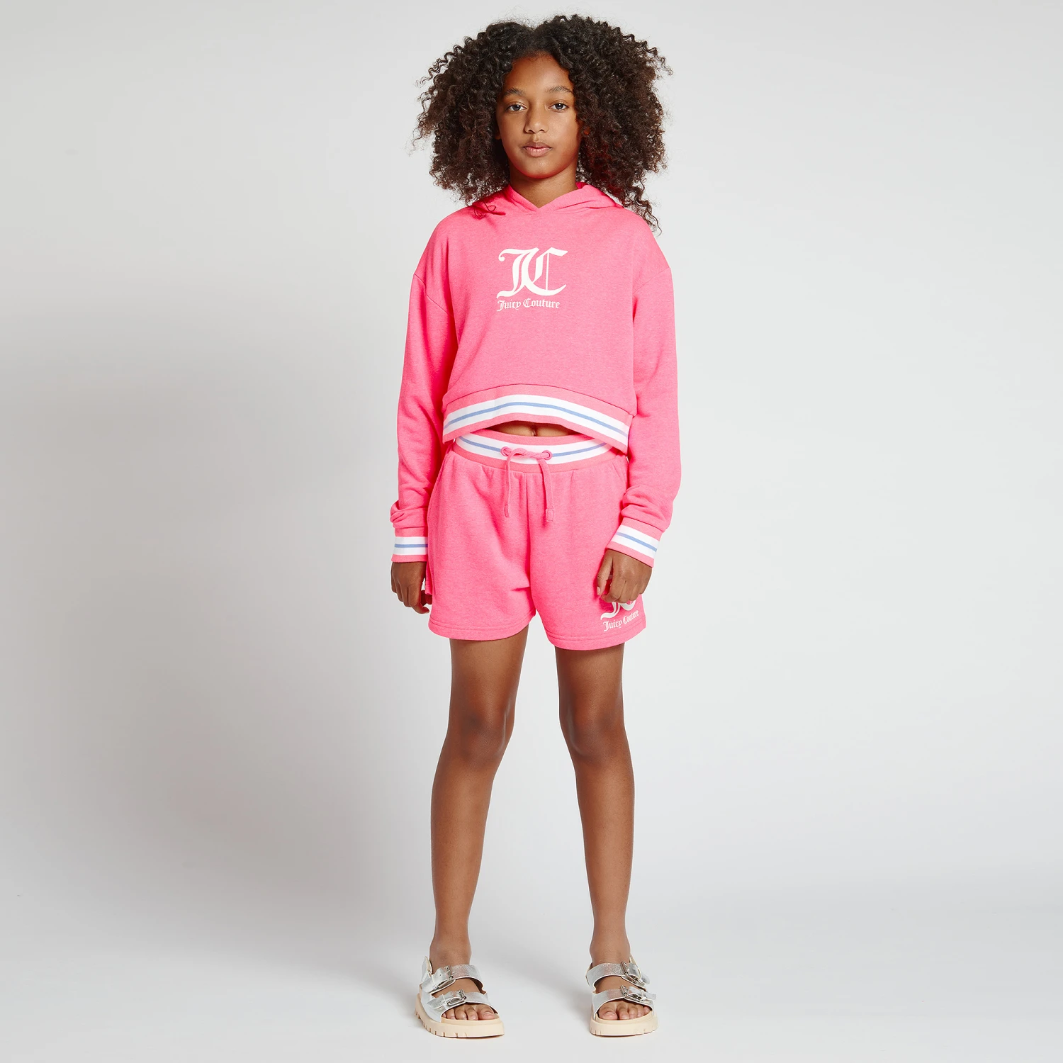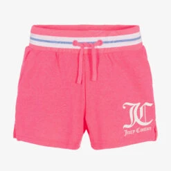Bright neon pink shorts for girls by Juicy Couture, made in soft cotton jersey. Casually stylish, they have a rubberised ‘JC’ logo on one leg, with a stretchy striped drawstring waistband. The pockets and looped underside ensure comfortable wear.