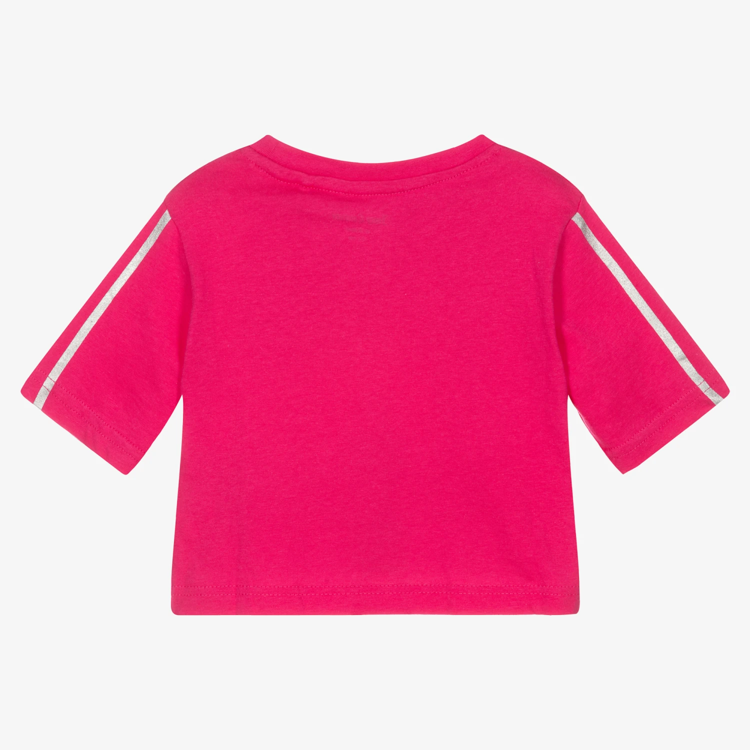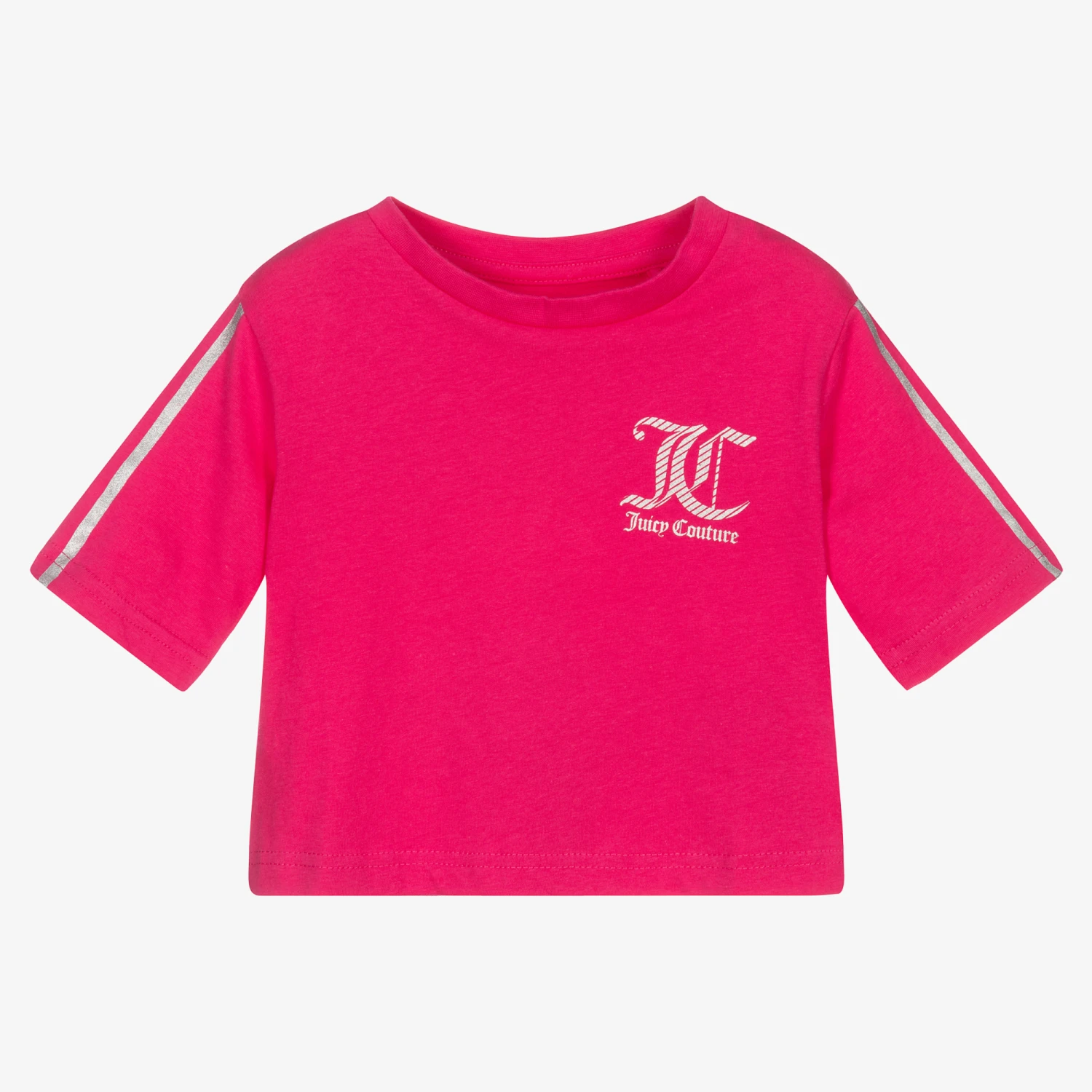 Fuchsia pink cropped T-shirt for girls by Juicy Couture, made in soft cotton jersey. This boxy style top has silver stripes on the sleeves, with a matching logo print on the chest.