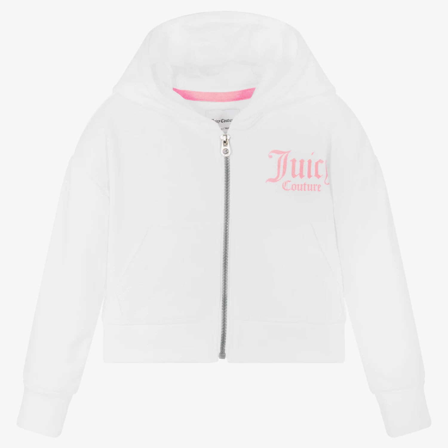 White zip-up hooded top for girls by Juicy Couture, with a neon pink logo print on the chest. Made in soft cotton-blend sweatshirt jersey, it has a branded zip fastening and pouch pockets on the front.