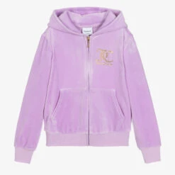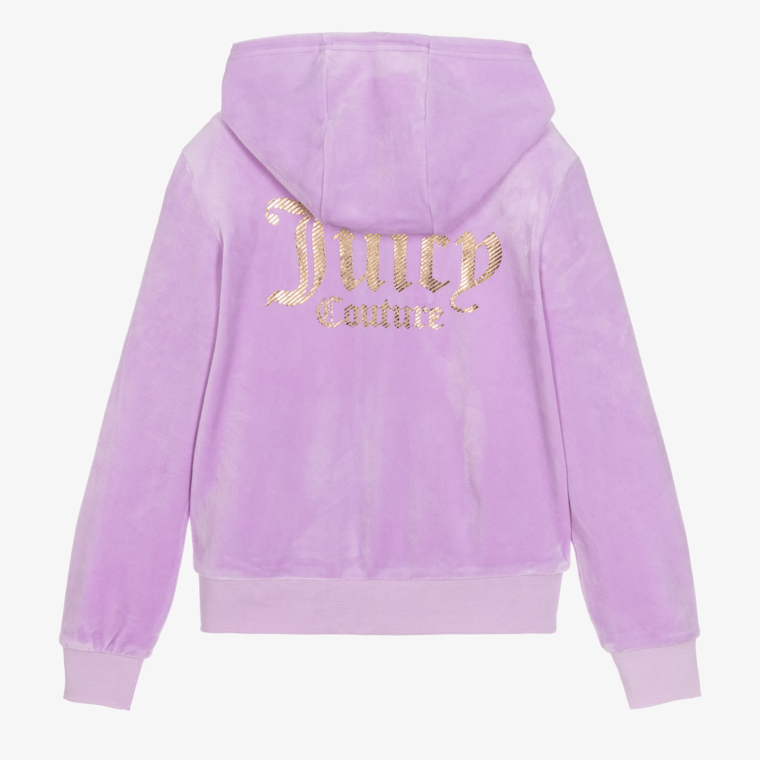 Purple zip-up hooded top for girls by Juicy Couture, made in super soft and stretchy velour. It has shiny gold logo prints on the chest and across the back, a branded metal ‘J’ zip pull and pouch pockets.