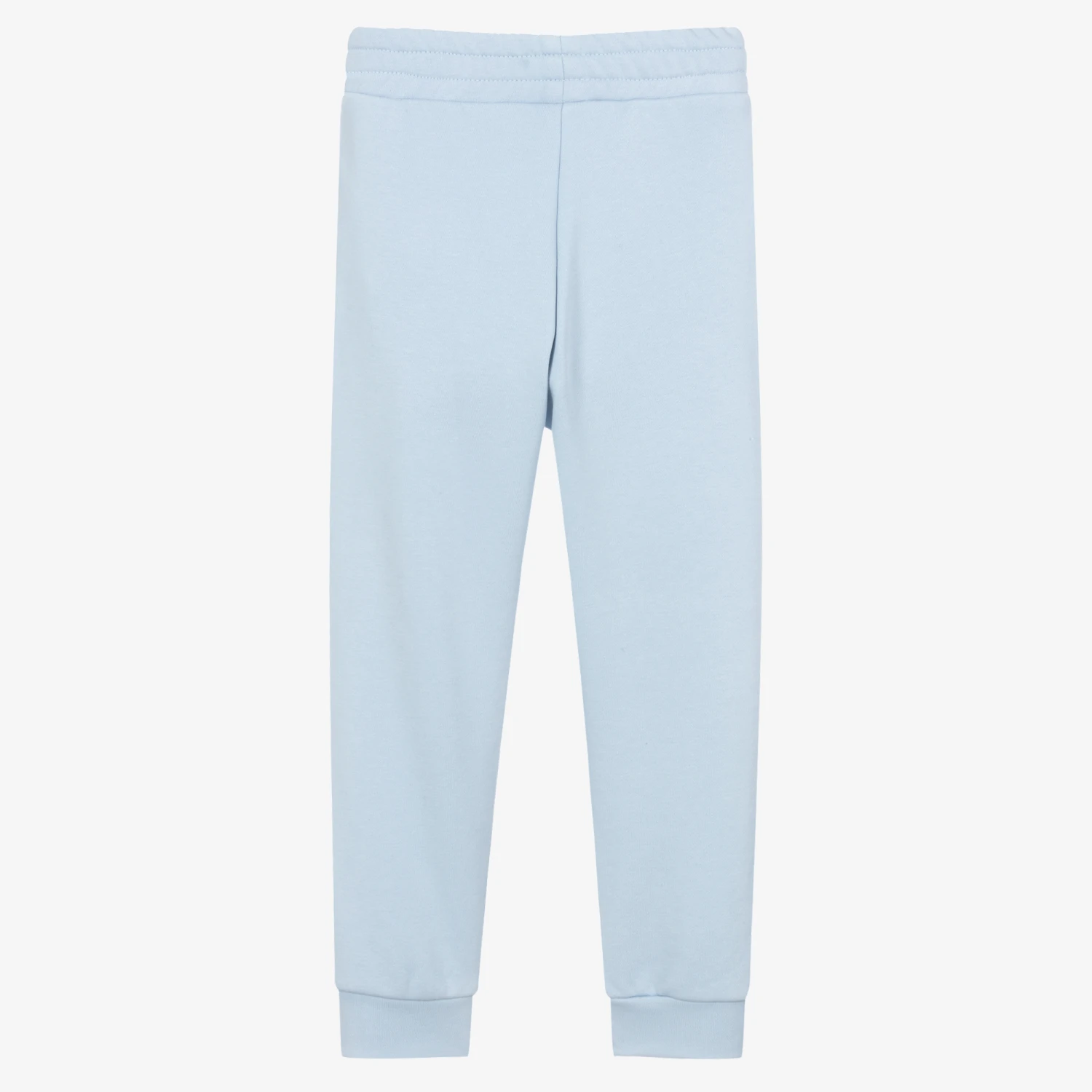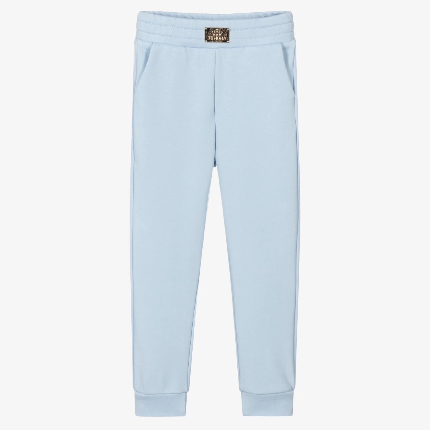 Pale blue joggers for girls by Junona, with a shiny gold metal logo plate on the front. Lovely for lounging, it is made in soft cotton jersey, with a comfortable elasticated waist. There are useful slanted pockets on the hips.