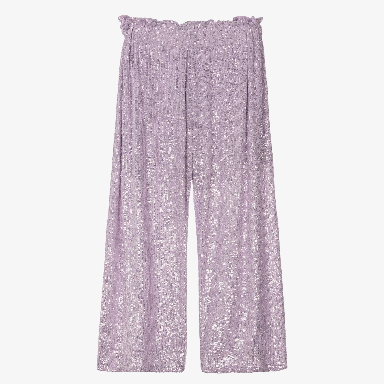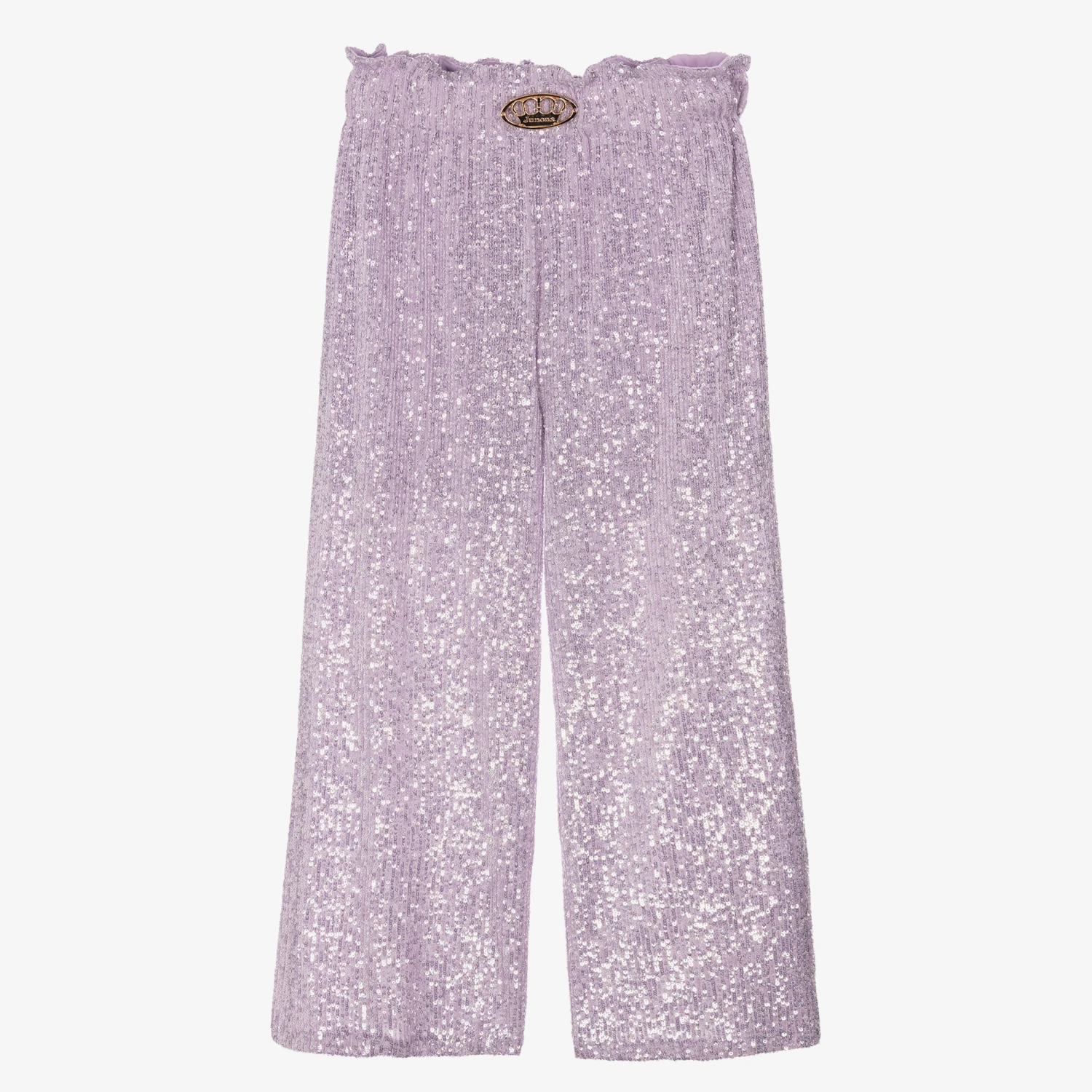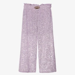 Girls will make a statement in these lilac purple trousers by Junona, beautifully embellished with iridescent sequins for eye-catching sparkle. Partially lined for comfort, they have an elasticated waist with a gold logo charm on the front to complete the look. The wide leg fit creates a striking silhouette.